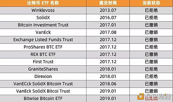 一、未能逃脱魔咒的比特币 ETF2018 年底的预测中,言之凿凿“ 2019 年将是比特币 ETF 通过之年”。但随着 1 月初提交的 ETF 申请一份自主撤销,一份被 SEC 拒绝,2019 年最受看好的冲刺均告折戟。