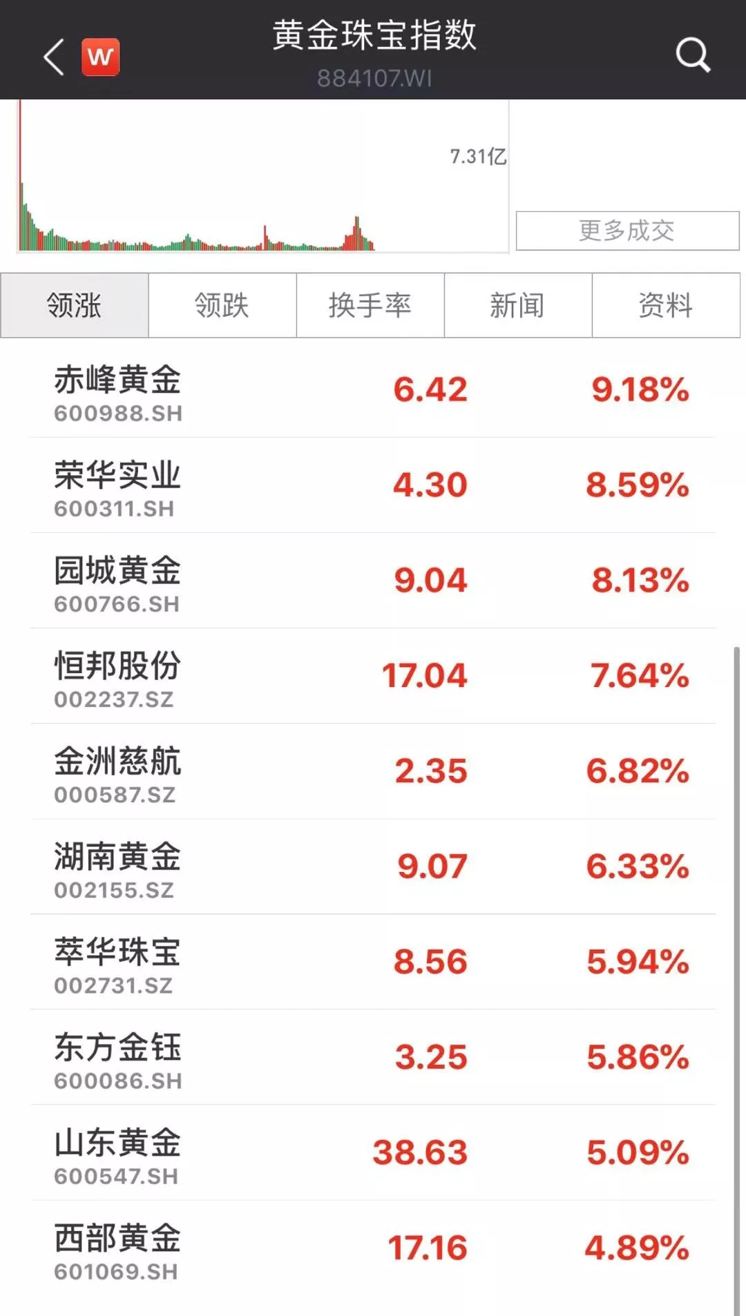 受避险情绪影响,黄金概念股走强,恒邦股份、赤峰黄金、荣华实业、园城黄金等涨近9%。