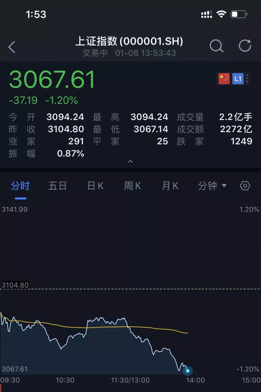 1月8日下午开盘后,A股三大指数小幅跳水全线下跌,上证指数跌超1%,创业板指数跌1.5%。