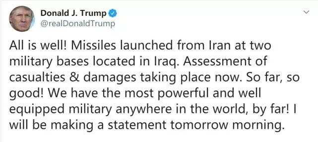 美国总统特朗普在推特上发文回应驻伊拉克美军基地遭伊朗弹道导弹袭击,他说:”一切都好!伊朗向位于伊拉克的两个军事基地发射了导弹。目前正在对伤亡和损失进行评估。到目前为止一切都好!我们有世界上最强大、装备精良的军队,到目前为止!我明天早上会发表声明。