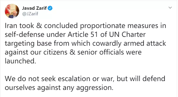 针对美军驻伊拉克“ al-Asad空军基地”遭导弹袭击事件,伊朗外交部长扎里夫发推文称,伊朗根据《联合国宪章》第51条,伊朗采取并完成了相应的自卫措施,我们不寻求局势恶化或战争,但会捍卫自己免受任何侵略。