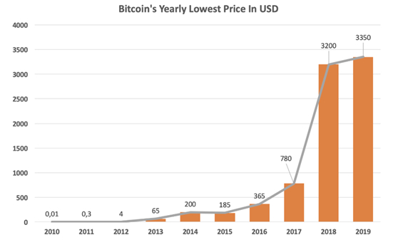 比特币的最低年价格从2010年的0.01美元升至2019年的3350美元。