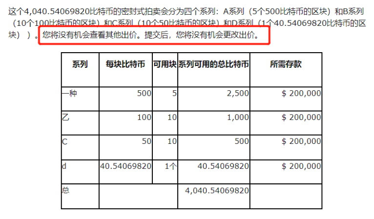 简而言之:官方不给拍卖的底价(也就是不会以比特币当前的价格作为起拍价格);如果你的出价中标了,官方会直接与中标者私下联系,不会公布所有竞拍人的出价情况,也不会公布中标人是以什么价格中标的。