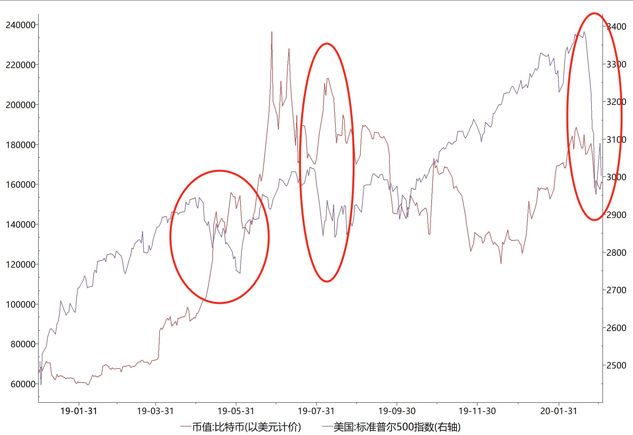 大趋势都是上涨的,说明这两种风险资产在这一年内表现都比较强劲,收益不错。但仔细看图中19年4月-6月和19年7月-8月(图中的前两个红圈区域),比特币与美股的涨跌出现了负相关性,不是说同一类型资产走势应该是正相关的吗?