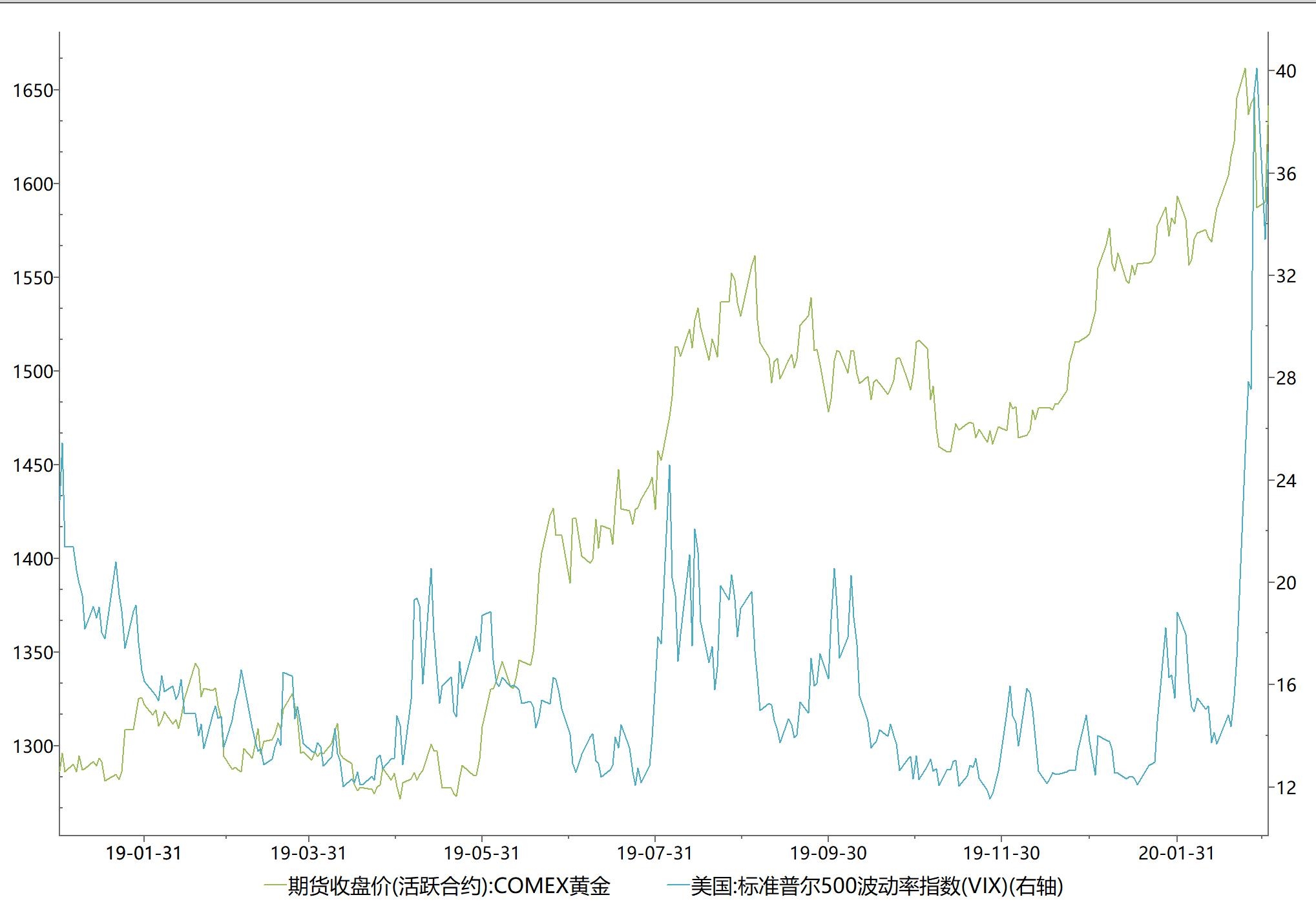 这是标普500波动率指数与黄金走势比较,上图波动率和黄金呈正相关关系,对比标普500指数来说,波动率与黄金会有更明显的相关性。