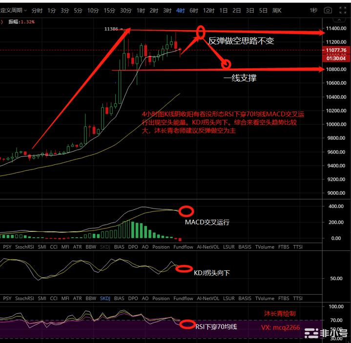 小时线KDJ有拐头迹象,RSI向下贯穿70均线,意味着短期会有一波回调,如果回调突破第一支撑位那么行情有可能结束高位震荡,若反弹能突破11386新高那么将会继续延展牛市多头。,如果一直压力和支撑不破则行情陷入维持一段时间的回调整理。