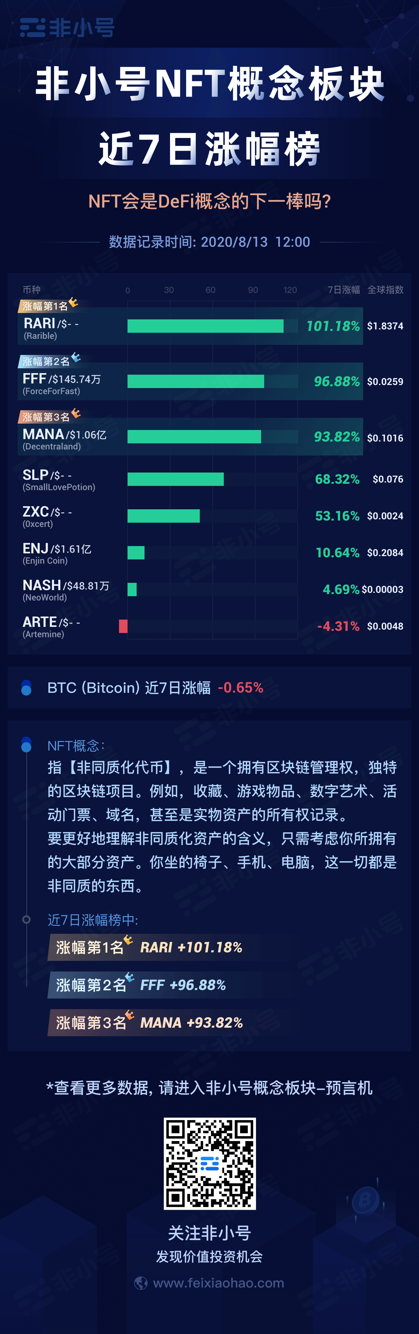 区块链游戏成热门?NFT代币涨幅榜单快速了解一下 非小号官方 2020年08月13日 10:03 微信扫一扫分享到朋友或朋友圈 还记得曾经一个NFT数字艺术作品卖出约5.55万美元高价吗?趁着 Defi 的热度,NFT再次涌现众多新项目,完整NFT币种涨幅榜单如下,可保存图片后分享: