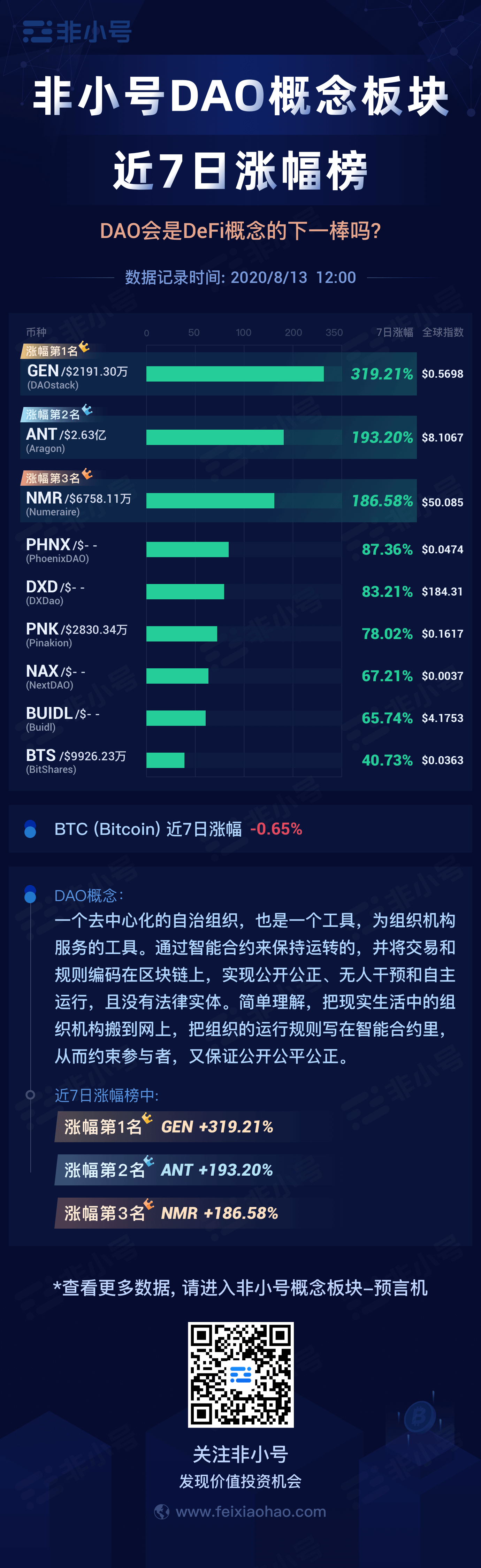 DAO 概念会比 Defi 更火吗?我们整理了DAO币种涨幅榜 非小号官方 2020年08月13日 10:34 微信扫一扫分享到朋友或朋友圈 一共有9个DAO币种,涨幅前三分别是:CEN 319.21%、ANT 193.2%、NMR 186.58%,可保存图片后分享: