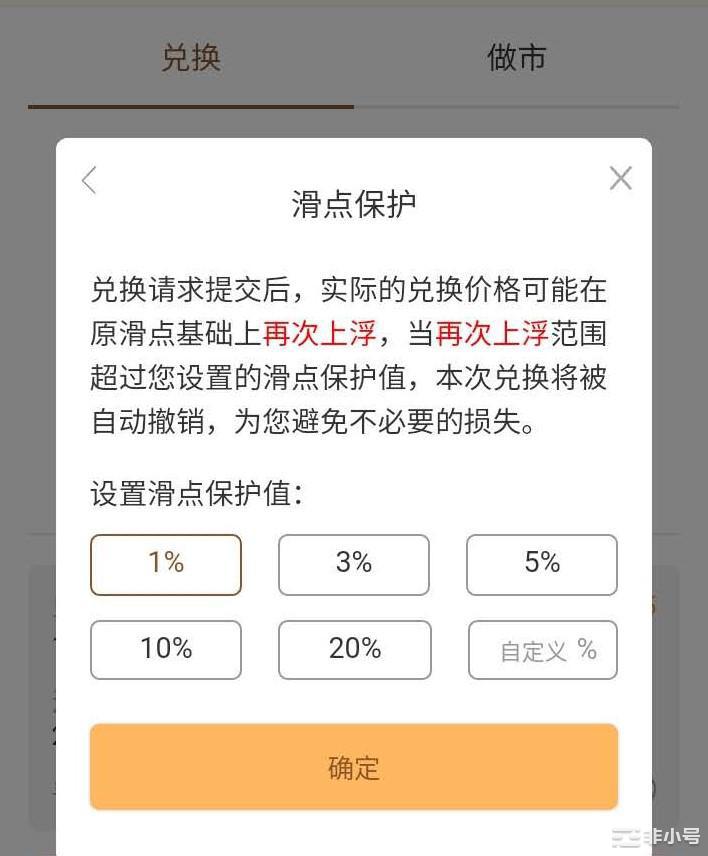 参考下图设置滑点保护,设置最低1%。只要流动池深度可以,实际兑换时一般都会小于1%,比如EOS-USDT交易对,你输入1 EOS,点击绿色的0.20%, 进入滑点保护设置界面,选择1%。记得每个兑换对做交易时,要再次设置滑点保护,以避免不必要的损失。