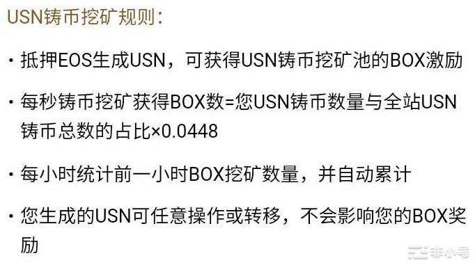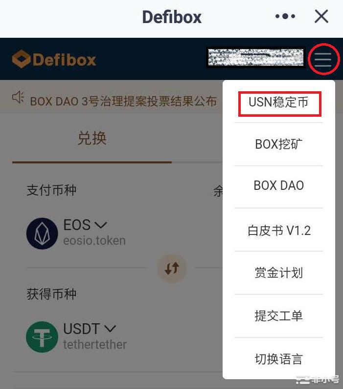 点击BOX界面右上角 “三”,选择下拉菜单USN,先了解下抵押铸币挖矿规则。