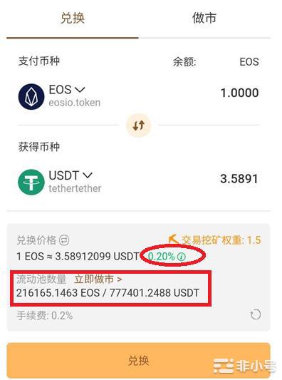 比如EOS-USDT交易对,目前流动池有21万的EOS和77万的USDT,深度还可以,所以可以看到溢价为0.2%,即你卖出的EOS可能比兑换价格低0.2%。