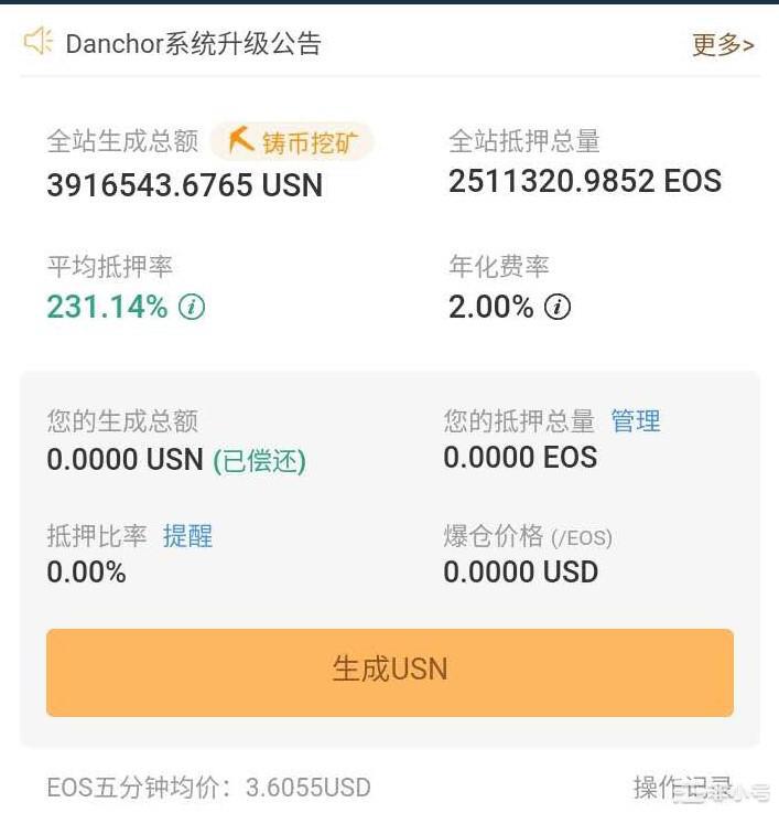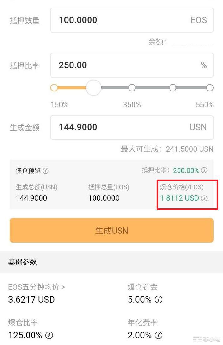 抵押率:比如抵押率200%, 那么1 EOS可以获得 0.5 EOS价格对应的USN。