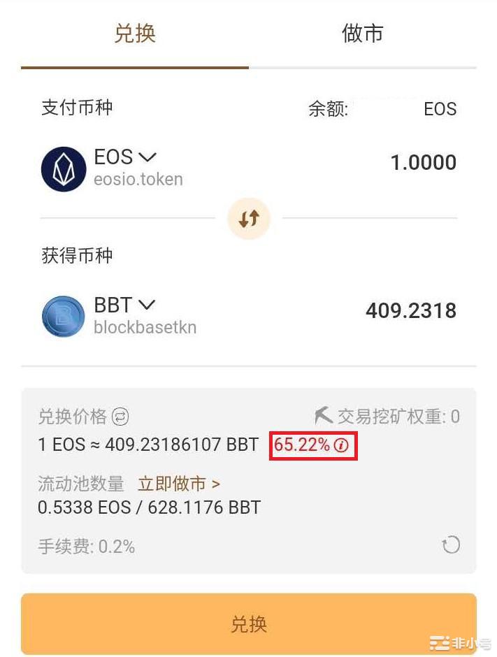 比如,EOS-BBT这个交易对,目前因为流动池只有0.5 EOS和628 BBT,所以溢价高达65%,即如果用EOS兑换BBT,你将亏损高达65%。