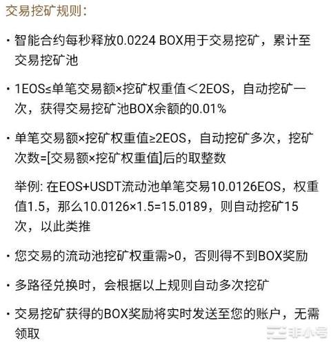 点击BOX界面右上角 “三”,选择下拉菜单BOX挖矿,先了解下交易挖矿规则。 (文中提到的交易和兑换是一个意思)