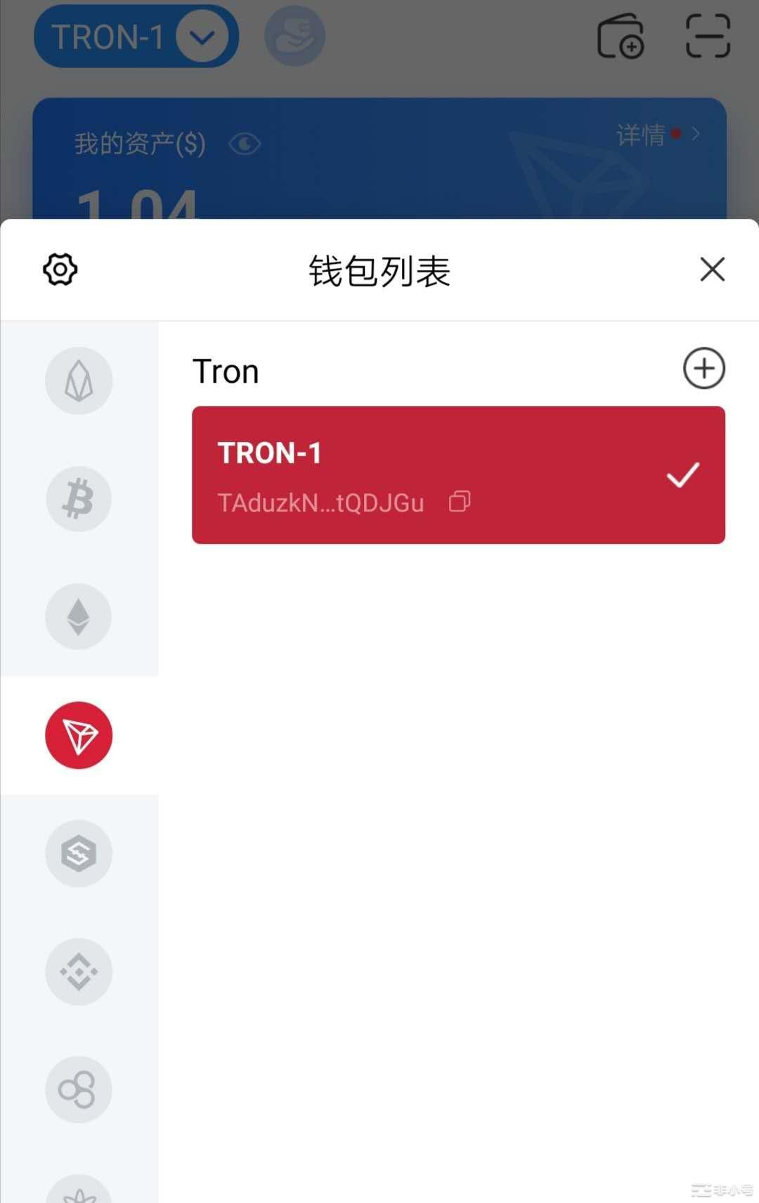 2. 安装完TP钱包之后,同样需要导入或者注册波场钱包,上面图中红色图标里面那个是波场的钱包符号,导入成功之后就是图上那个样子。