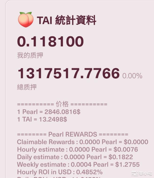 上图显示的是质押TAI 挖pearl的收益率,比USDT高很多,它的日化有11.64%, 是USDT的将近4倍了。
