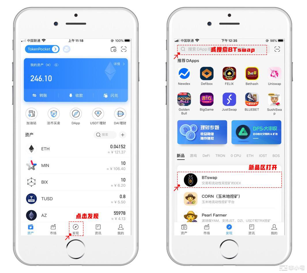 1. 打开TP钱包,点击底部【发现】菜单进入,在【新品区】打开或者通过【顶部搜索】BTswap打开应用。