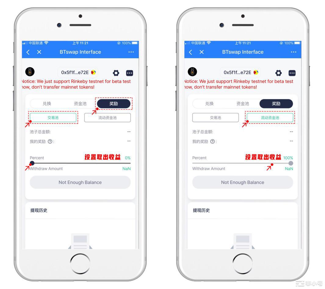 4. 最后一个环节是存入资金池后的【奖励】领取功能,在这里可以选择【交易池】和【流动资金池】这两项奖励收益领取,设置滑动条来选择领取奖励的比例,点击【转出】后即可领取收益到自己的钱包中。