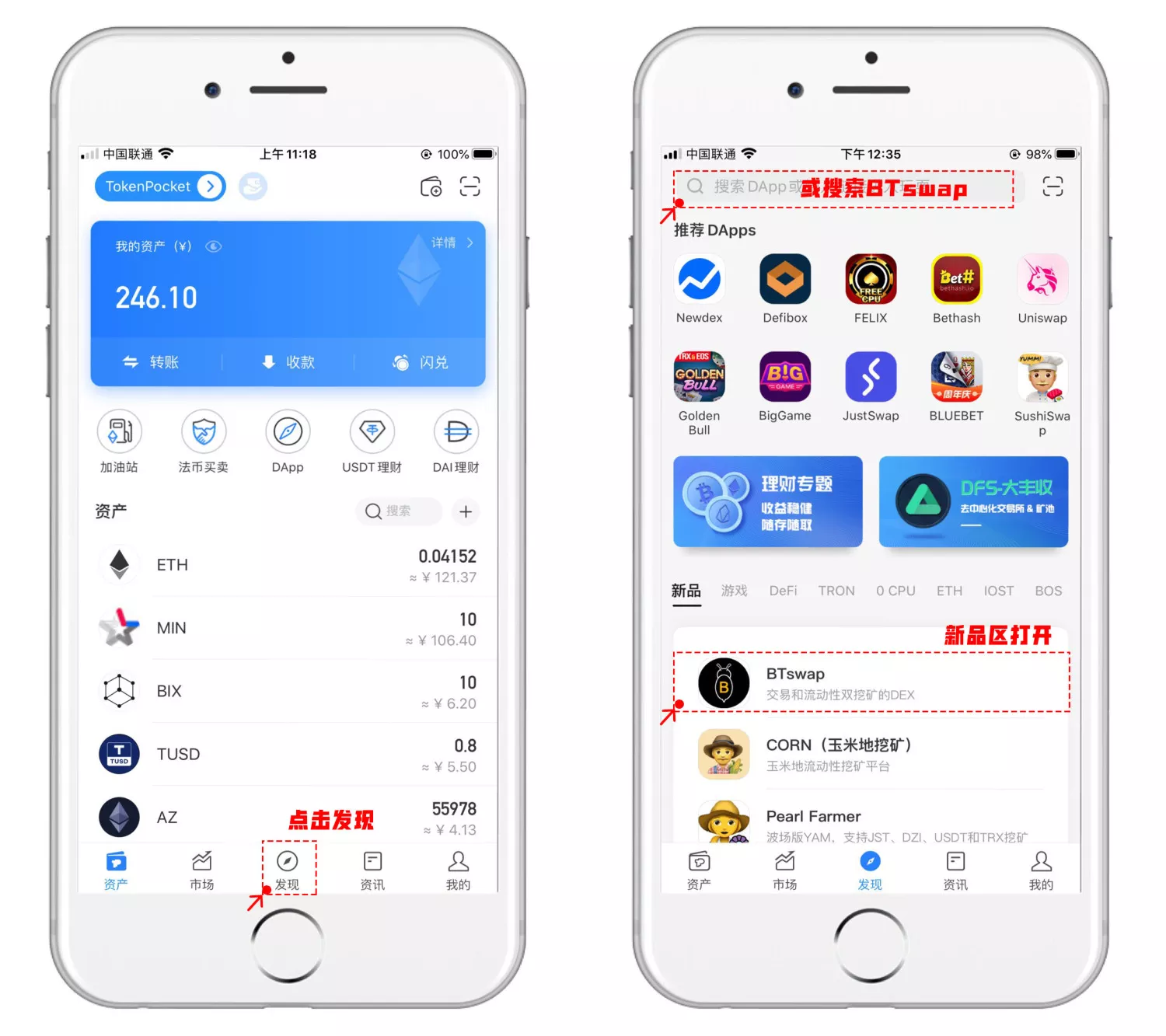 - 打开TP钱包,点击底部【发现】菜单进入,在【新品区】打开或者通过【顶部搜索】BTswap打开应用。