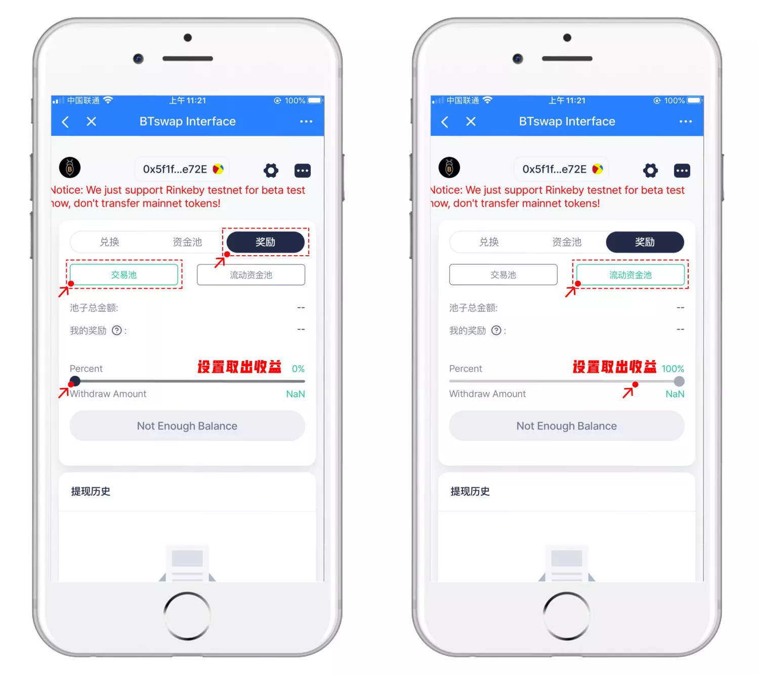 - 最后一个环节是存入资金池后的【奖励】领取功能,在这里可以选择【交易池】和【流动资金池】这两项奖励收益领取,设置滑动条来选择领取奖励的比例,点击【转出】后即可领取收益到自己的钱包中。