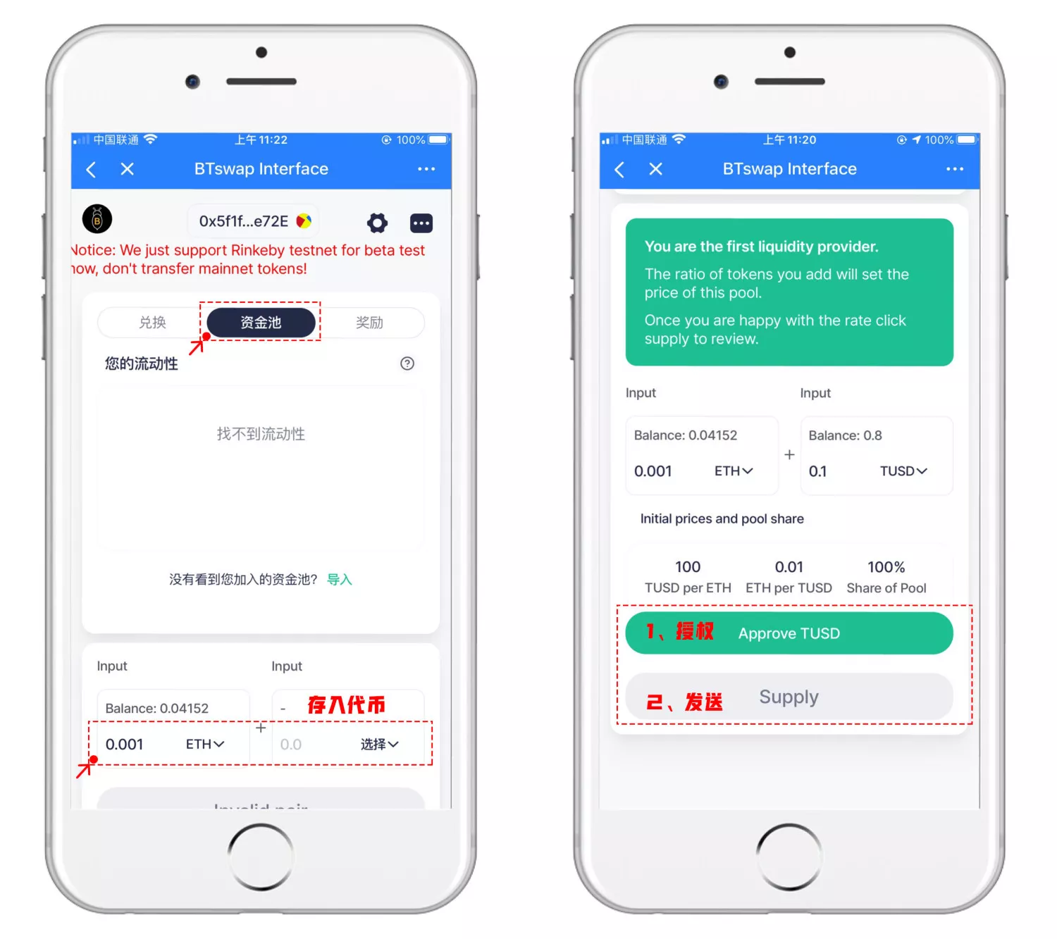 - 点击选择【资金池】,这里可以存入代币进行做市,可以获得收益。界面底部选择需要存入的代币对,设置好数量后即可看到【Approve TUSD】的高亮提示,这里是对TUSD代币进行授权,授权后再次点击Supply即可存入到资金池里面。