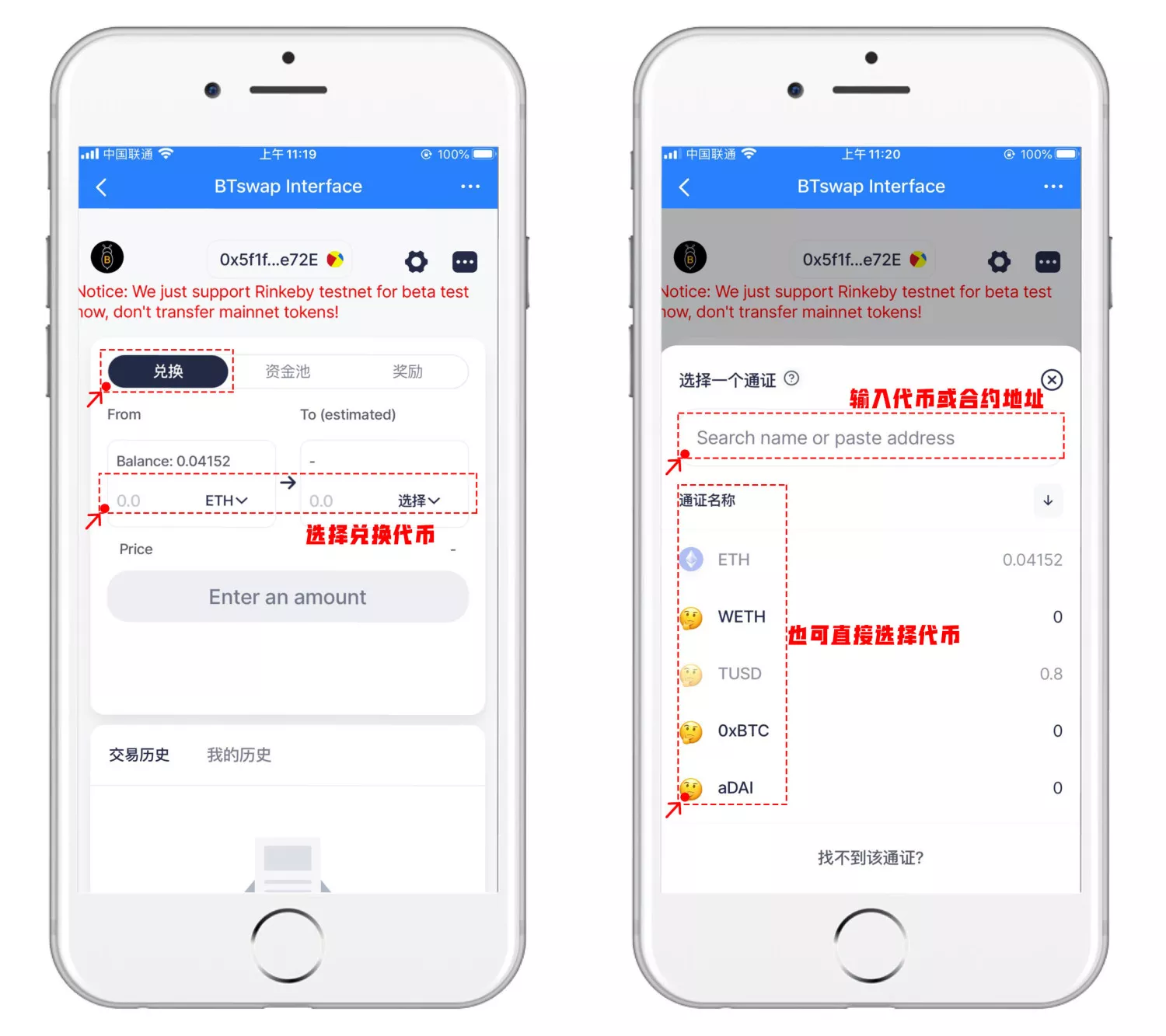 - BTswap的操作界面很简洁,如果用过Uniswap的同学能很快上手,默认打开的是【兑换】界面,在这里可以选择需要交易的交易对,这里需要注意的是,在选择交易对的时候,可以输入代币名称搜索选取,也可以填入代币合约地址进行查看。设置好后设置数量进行兑换即可。