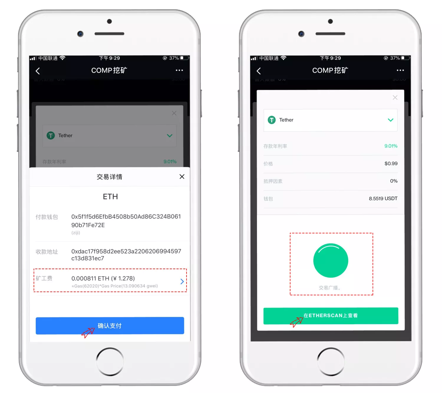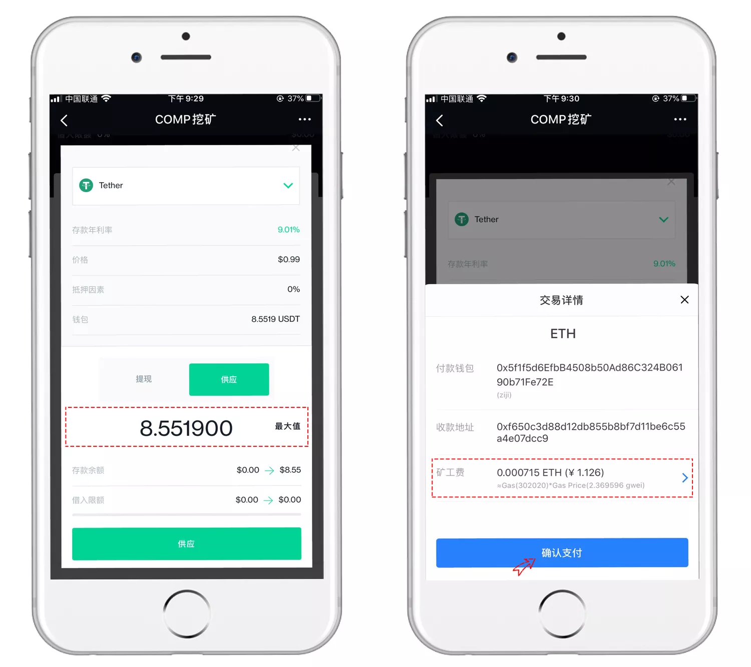 五、交易广播完成后即可设置供应的USDT数量(提现需要点击提现功能),这里以点击全部抵押为演示;唤起授权界面(GAS根据实际情况设置),完成支付后等待交易广播(或交易广播窗口刷新应用等待完成)