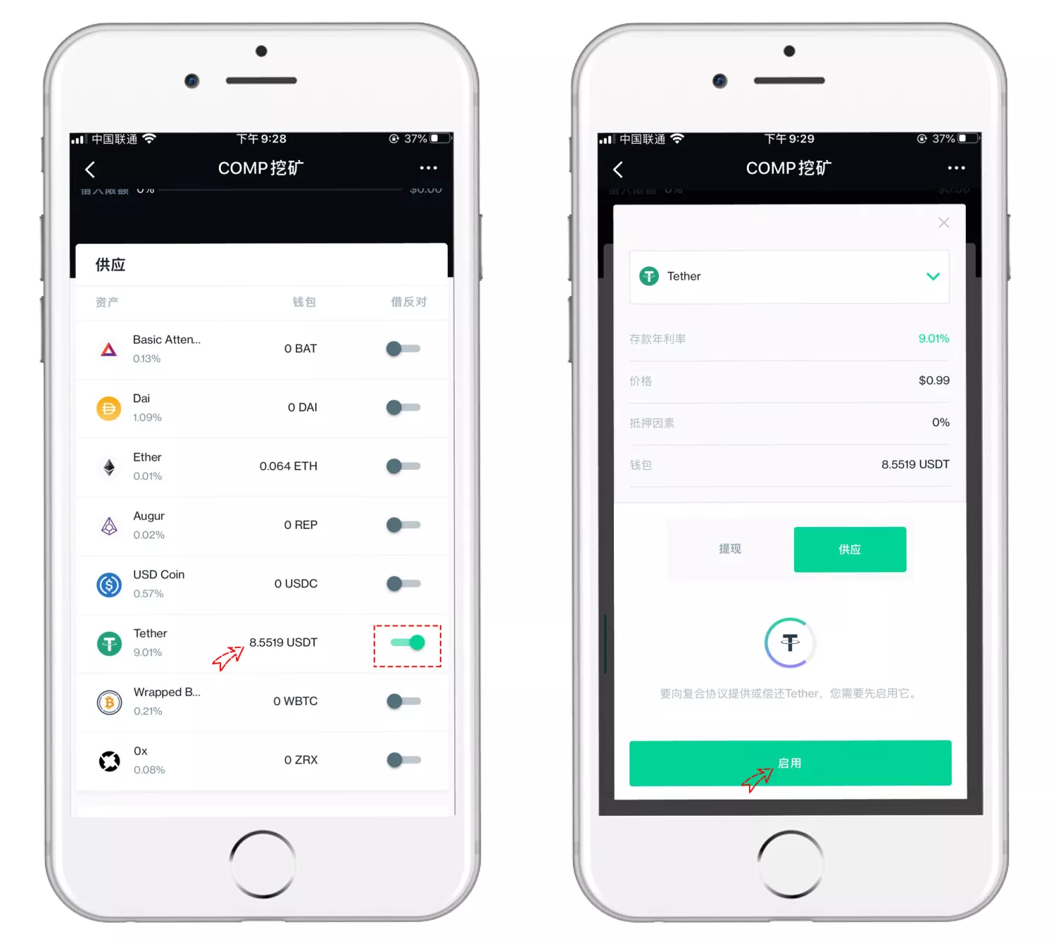 一、打开TP钱包(以太坊底层),点击顶部COMP挖矿入口进入应用;在应用中可以看到支持的代币类型(手机界面显示不完整,暂支持8种代币)、可用数量和开关(借反对)。
