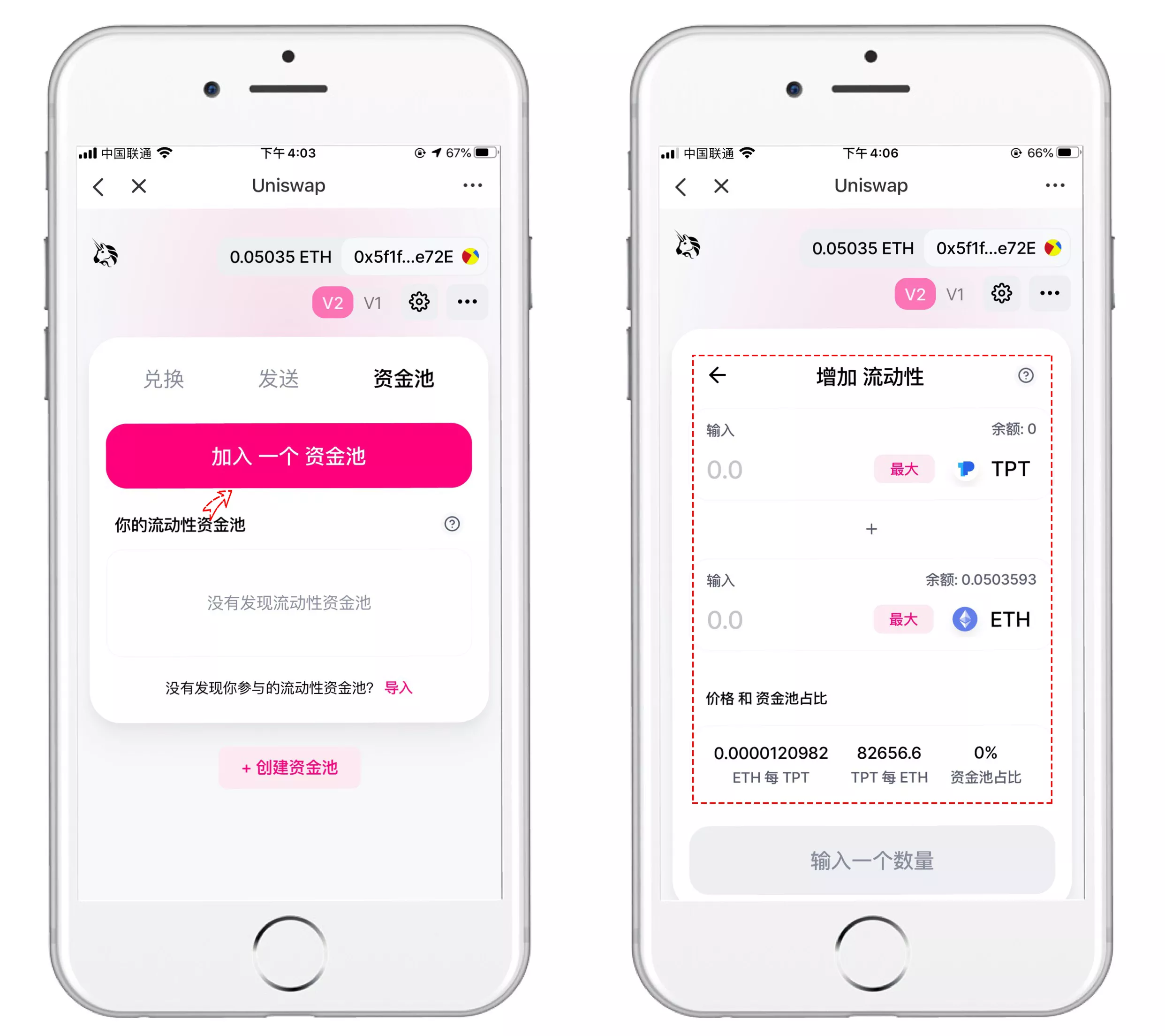 六、【资金池】功能,可以在这里点击【加入一个资金池】选择例如TPT/ETH的兑换组来进行设置,存入资金池从而增加更好的代币流动性(可以获得手续费收益)。