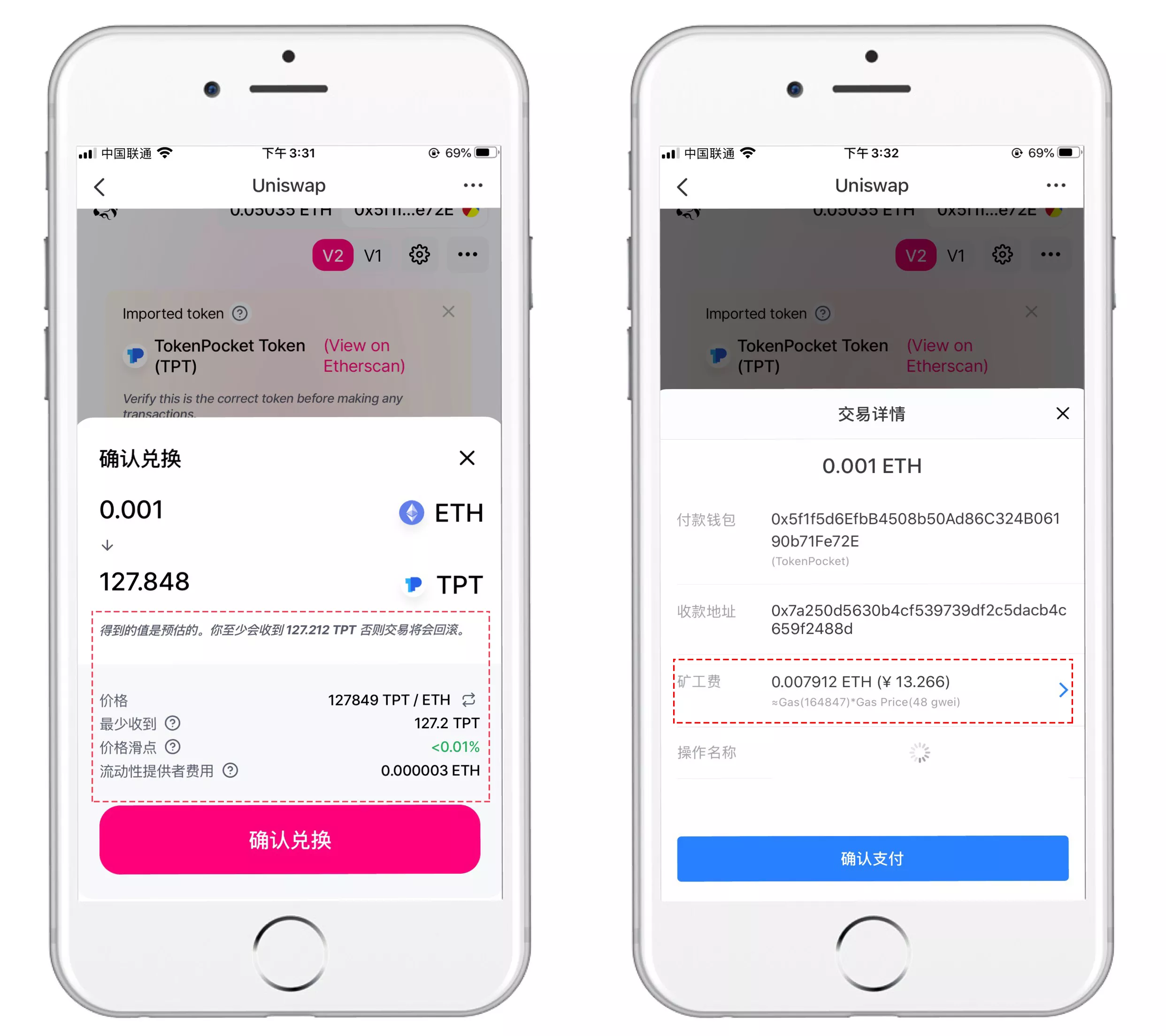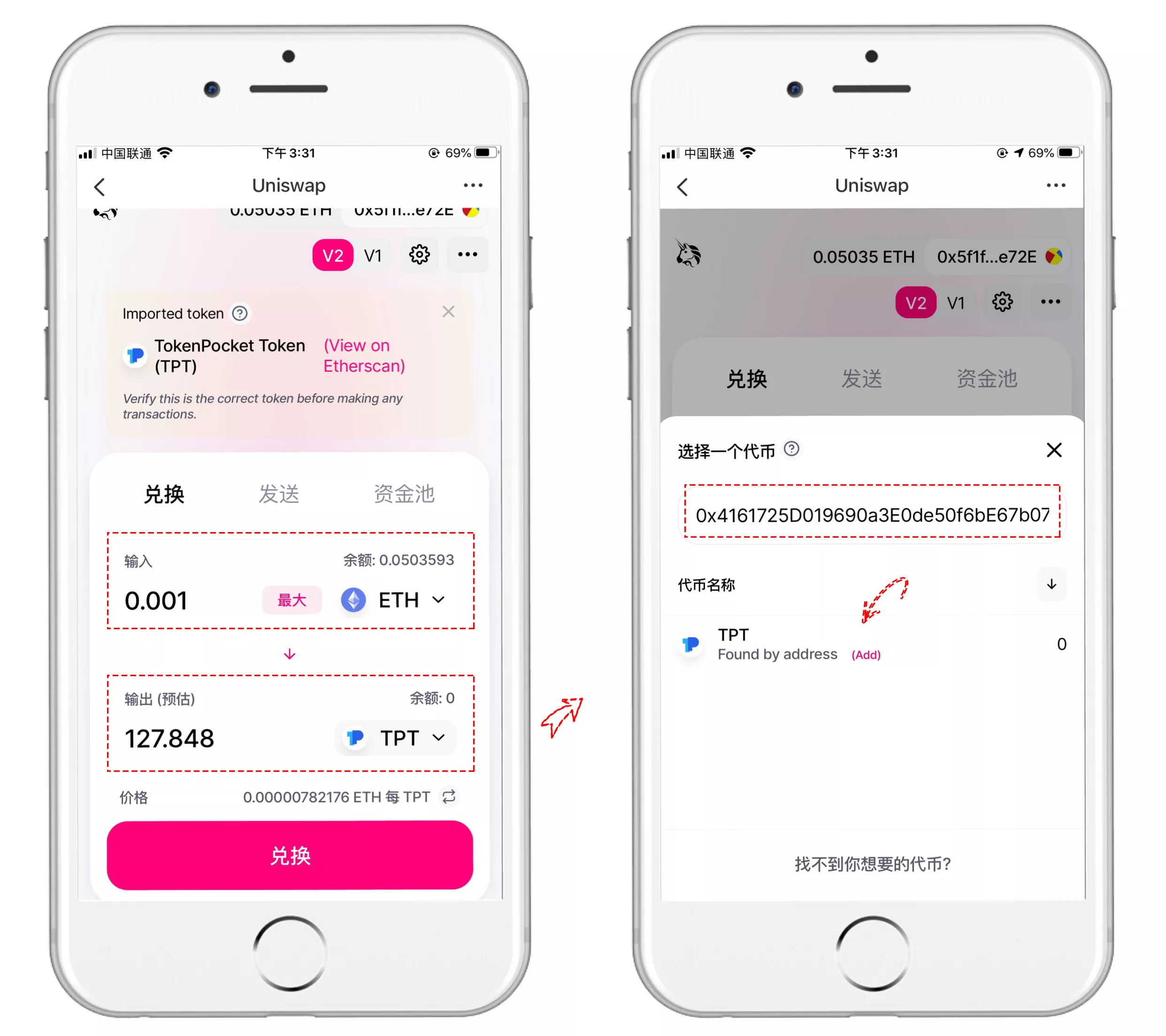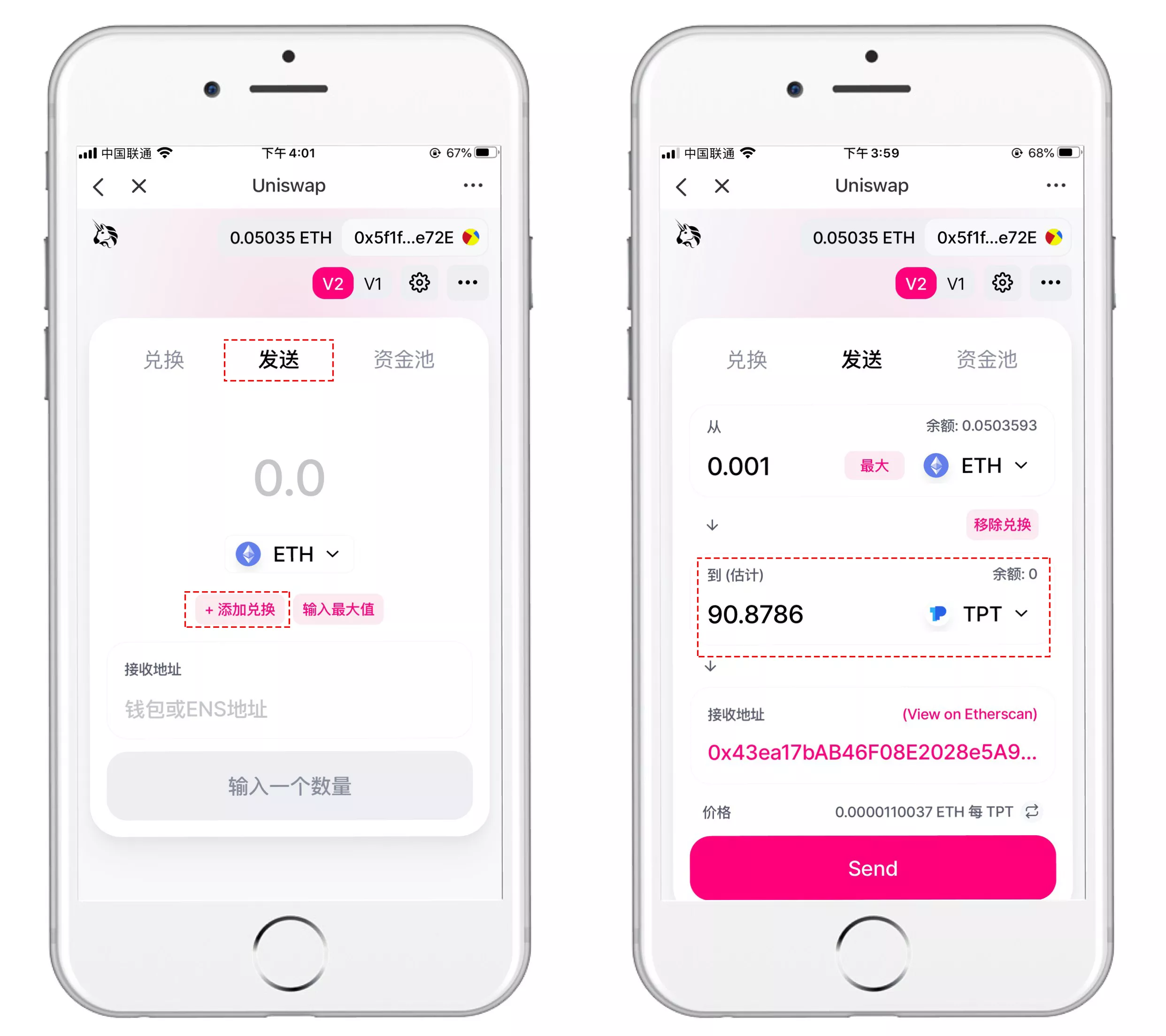 二、Uniswap主要分为三个功能,分别是【兑换】【发送】【资金池】,打开后默认显示兑换界面,在这里可以选择ETH或者其他代币(支持多种代币,就不一一列举了)互相兑换。下面的输出代币选择需要兑换的目标币,这里选择TPT(苹果移动端暂时只能通过合约地址:0x4161725d019690a3e0de50f6be67b07a86a9fae1来加入选择TPT)。