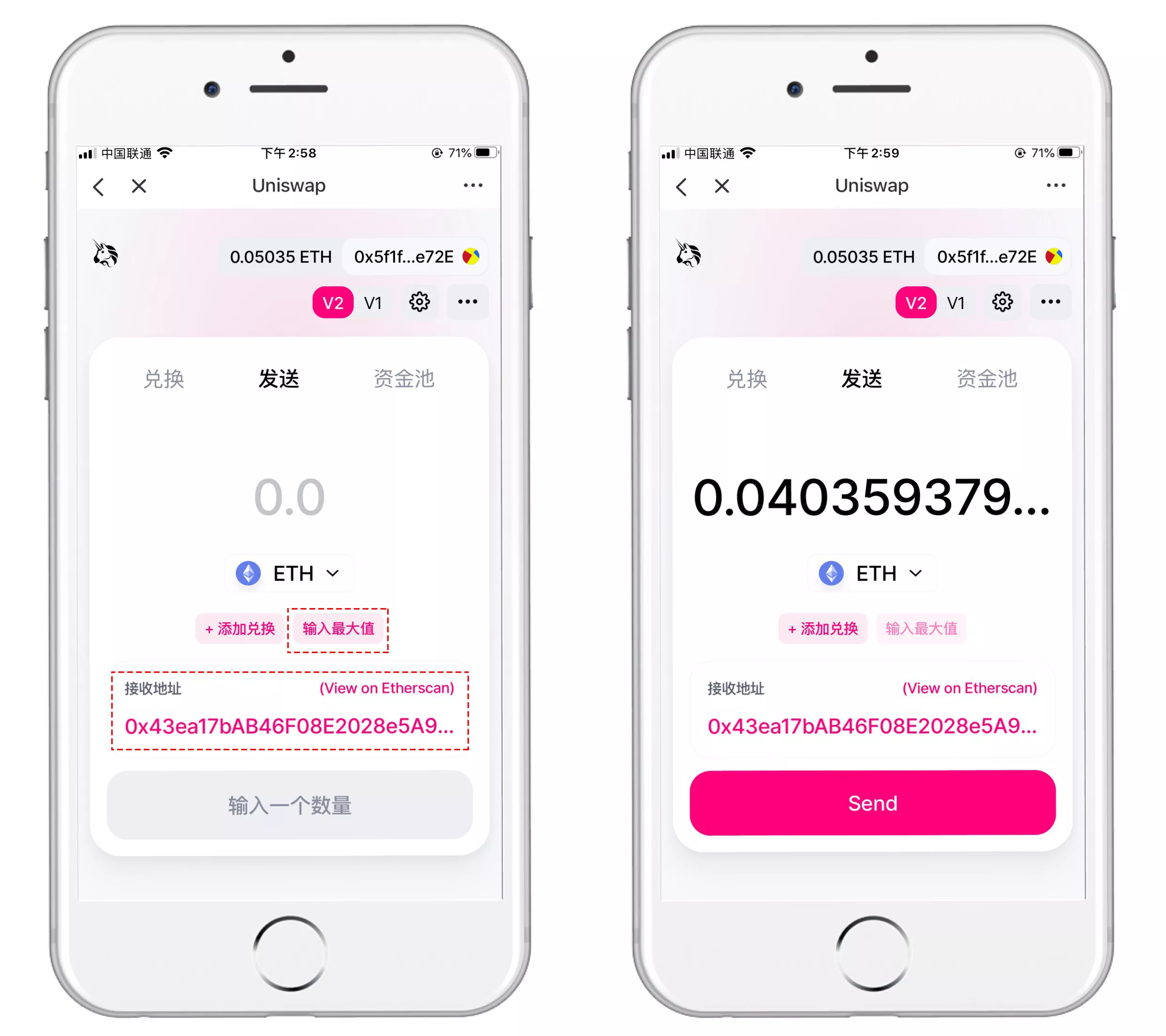 四、【发送】功能,既可以作为一个普通的代币转账工具,又可以兑换-转账一条龙服务。点击ETH上方设置发送数量,也可以直接选择【输入最大值】会自动帮助预留足够的gas发送剩余代币。转账地址需要正确填写即可,点击【Send】即可完成发送工作(可选其他代币)。