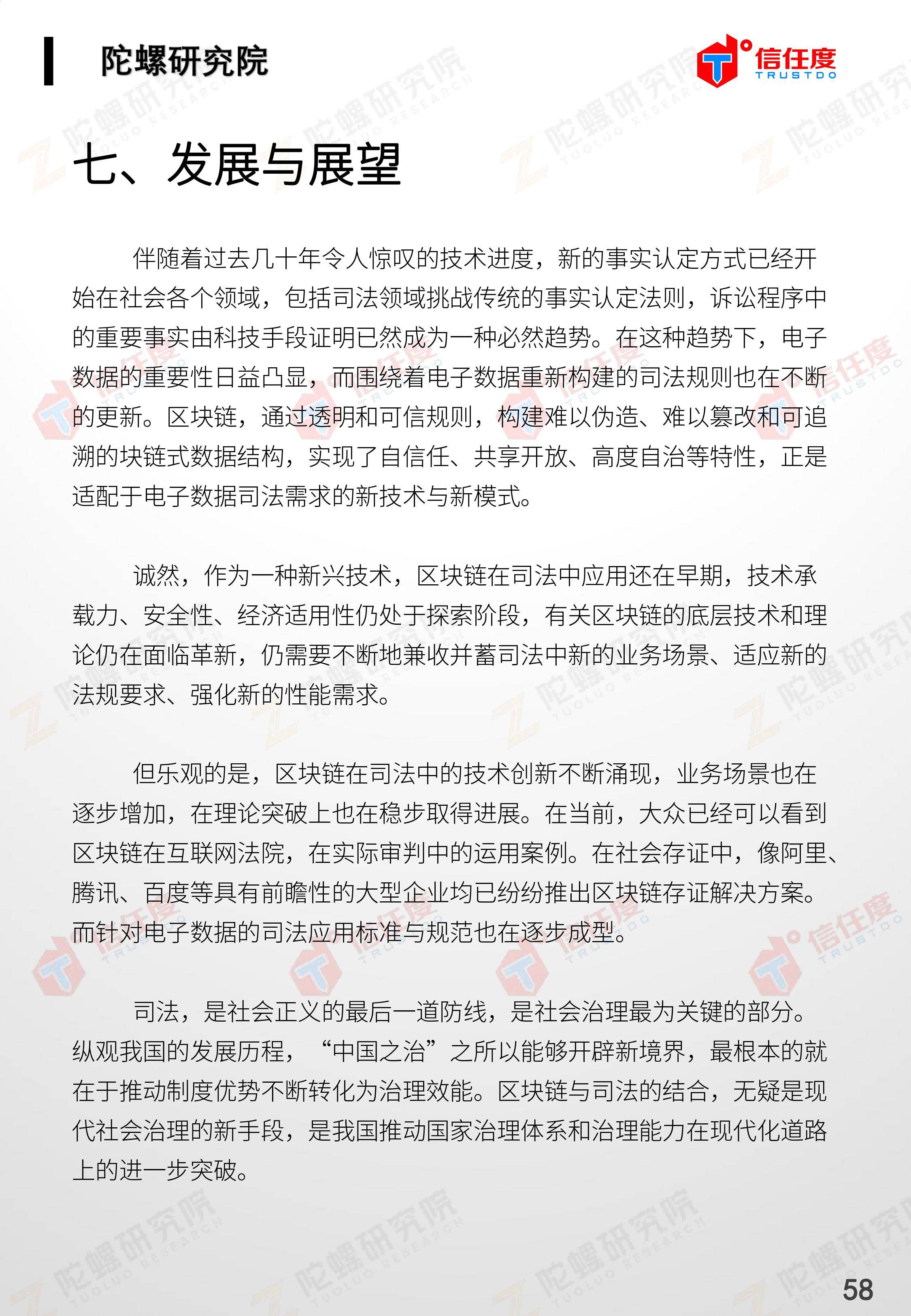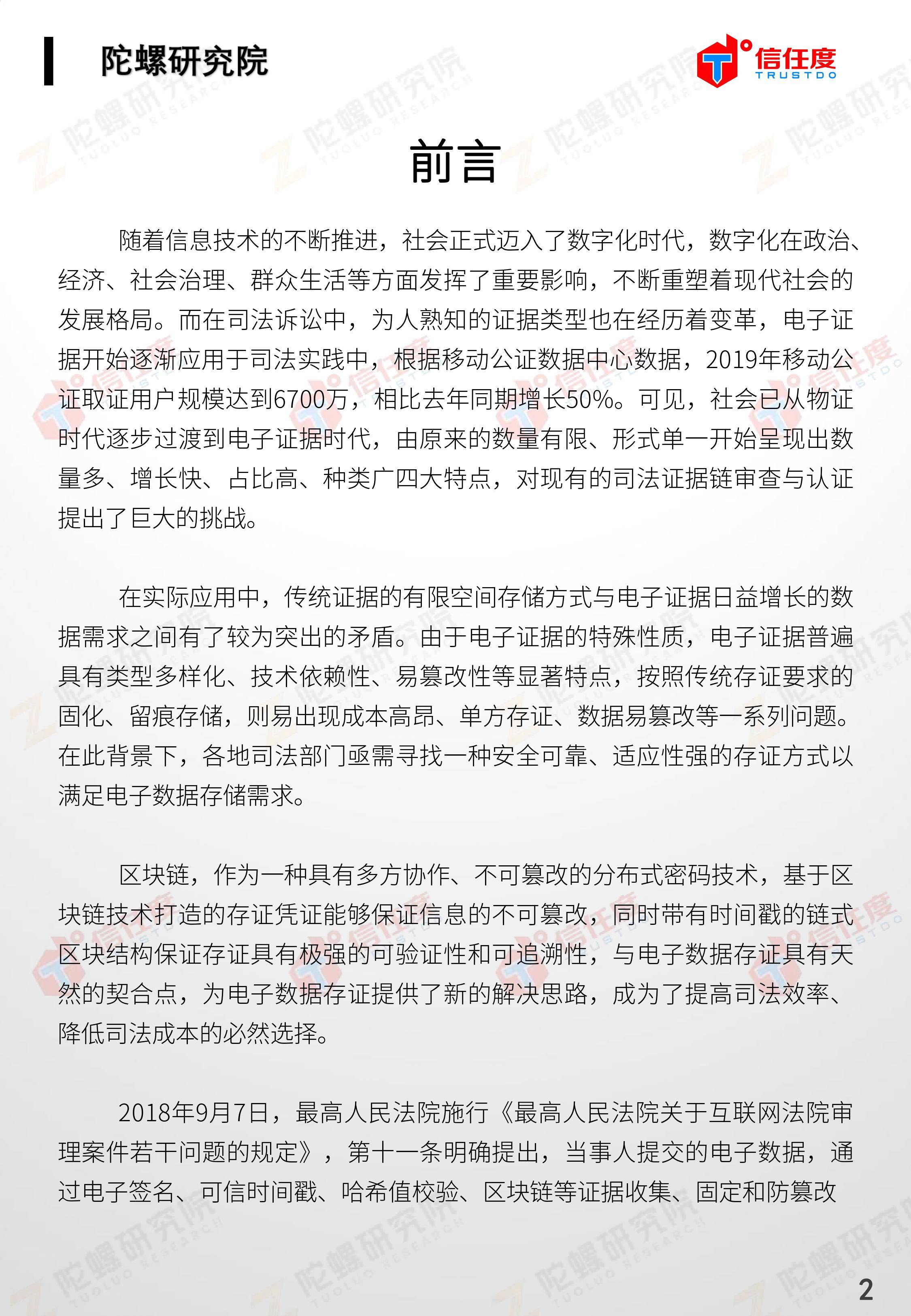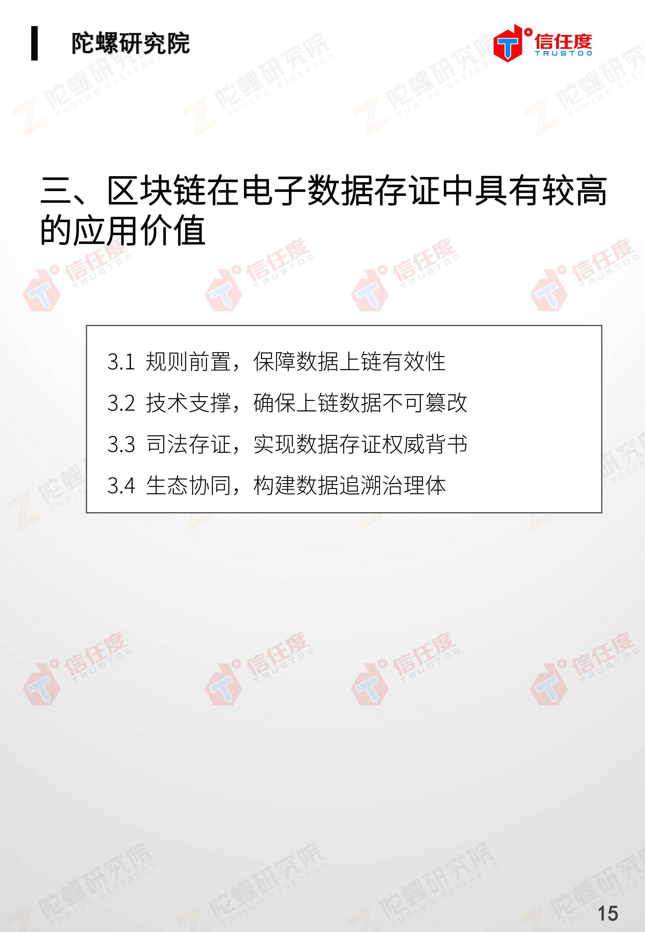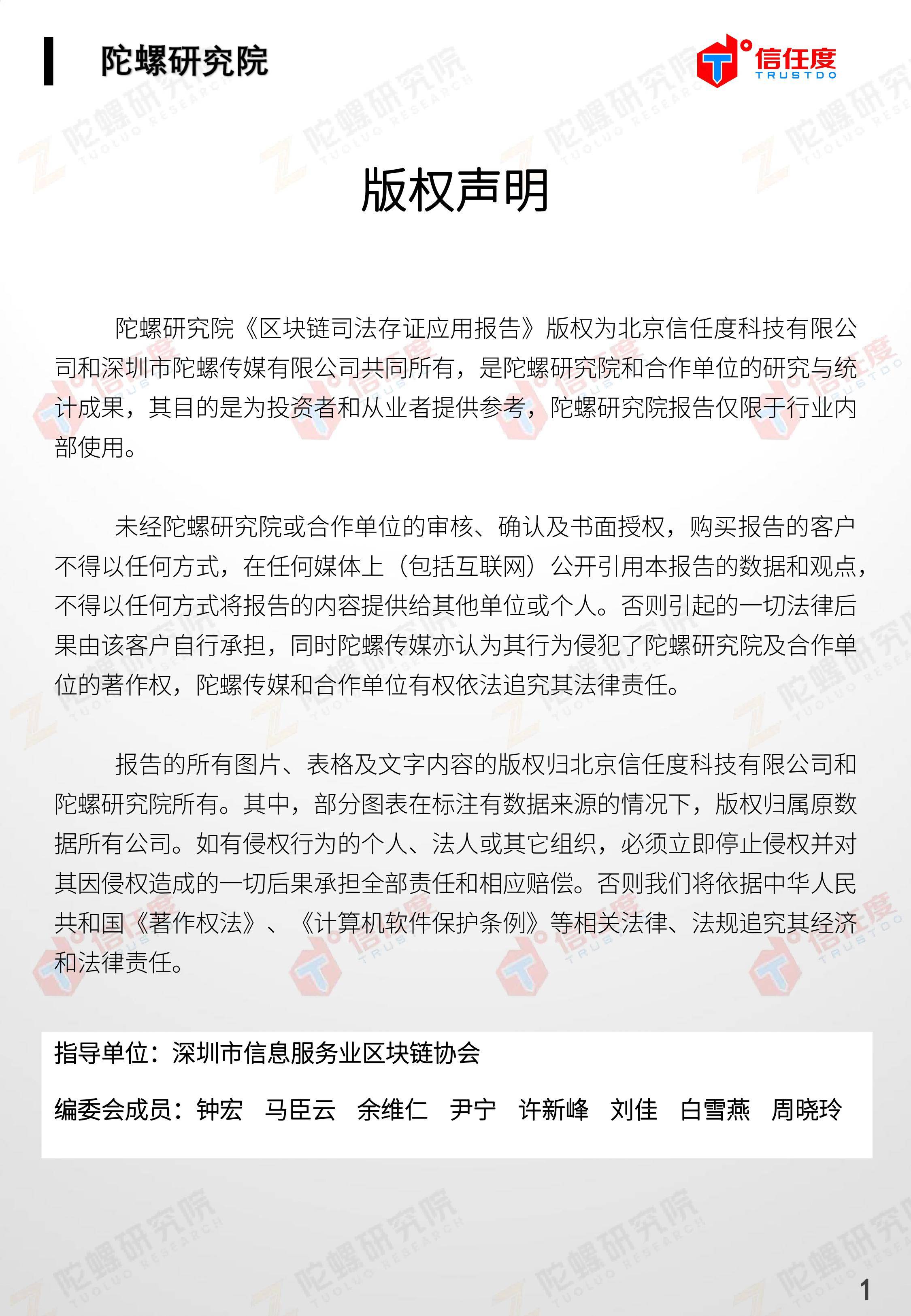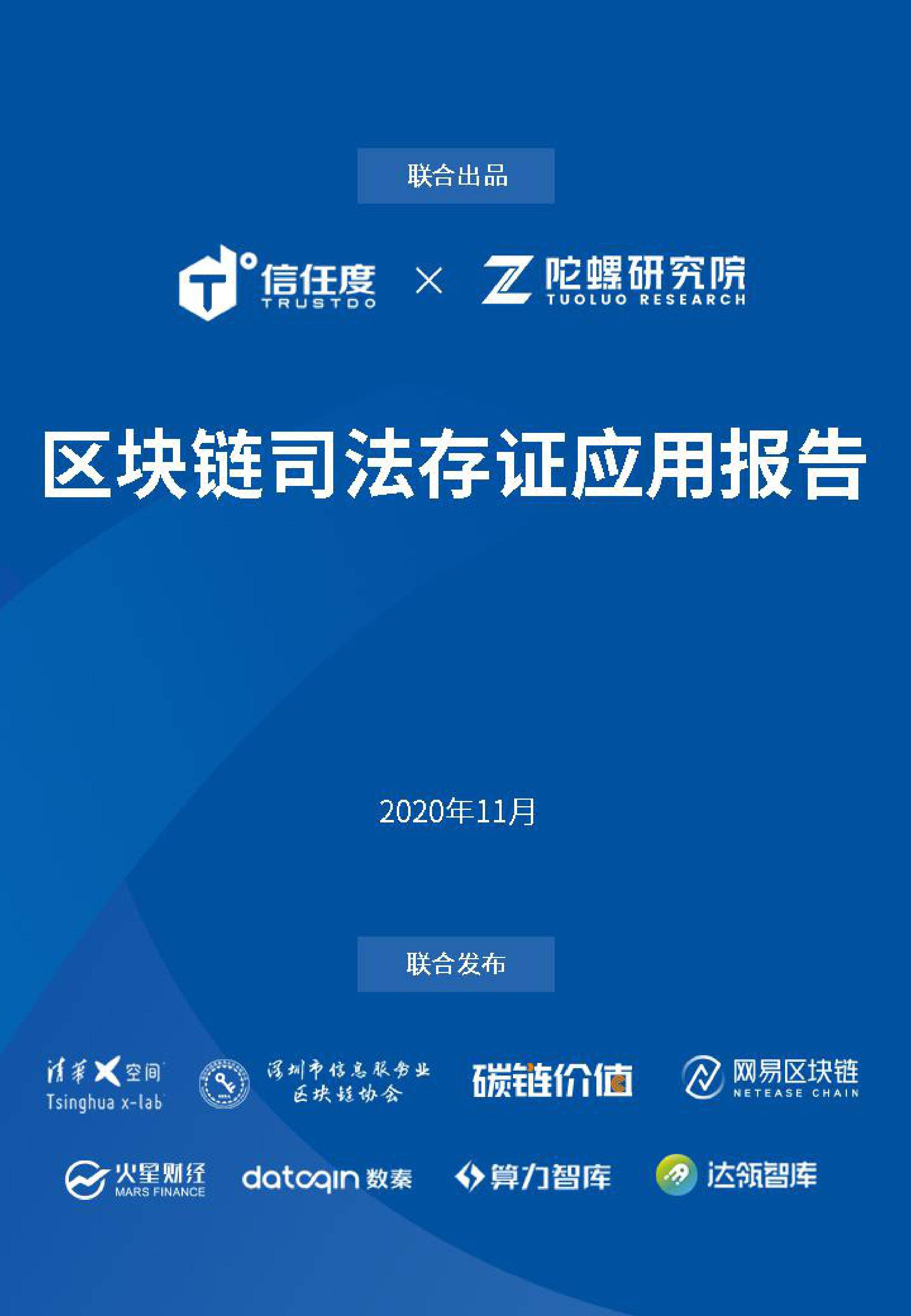 在此背景下,由陀螺研究院与北京信任度科技有限公司联合撰写,清华x-lab数权经济实验室、深圳市信息服务业区块链协会、碳链价值、网易区块链、商业科技观察、算力智库、数秦科技、火星财经、达瓴智库联合发布的《区块链司法存证应用报告》面市,本报告从电子数据存证背景入手,对当前电子数据存证司法应用存在问题进行了分析,介绍了区块链在电子数据存证中的应用价值,并针对区块链存证的应用场景与实际案例开展了深入研究,旨在加深社会大众对于区块链司法存证的理解,推动区块链在司法存证领域迸发出更大的价值。