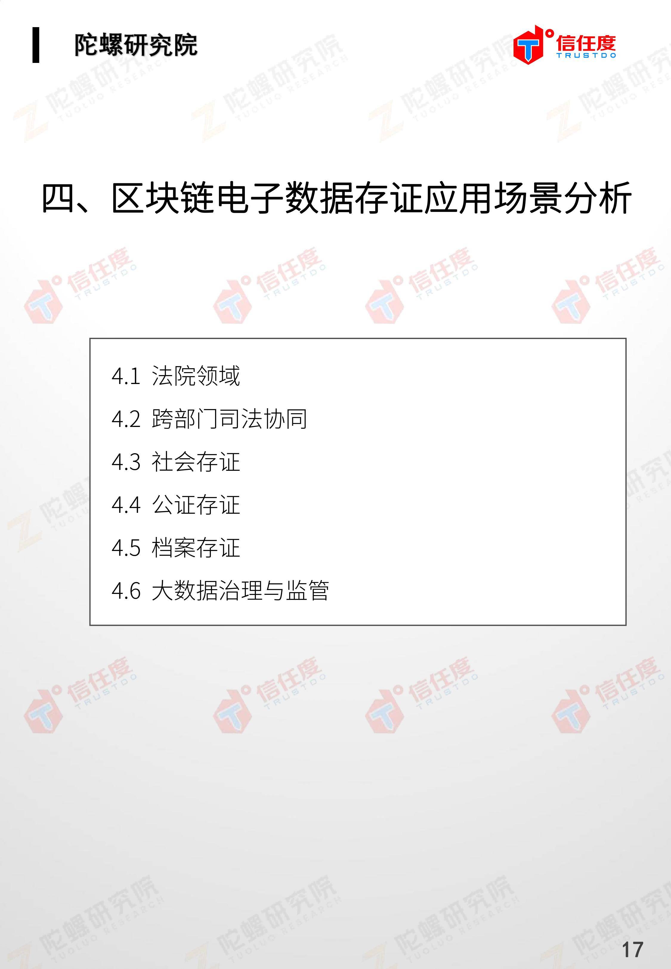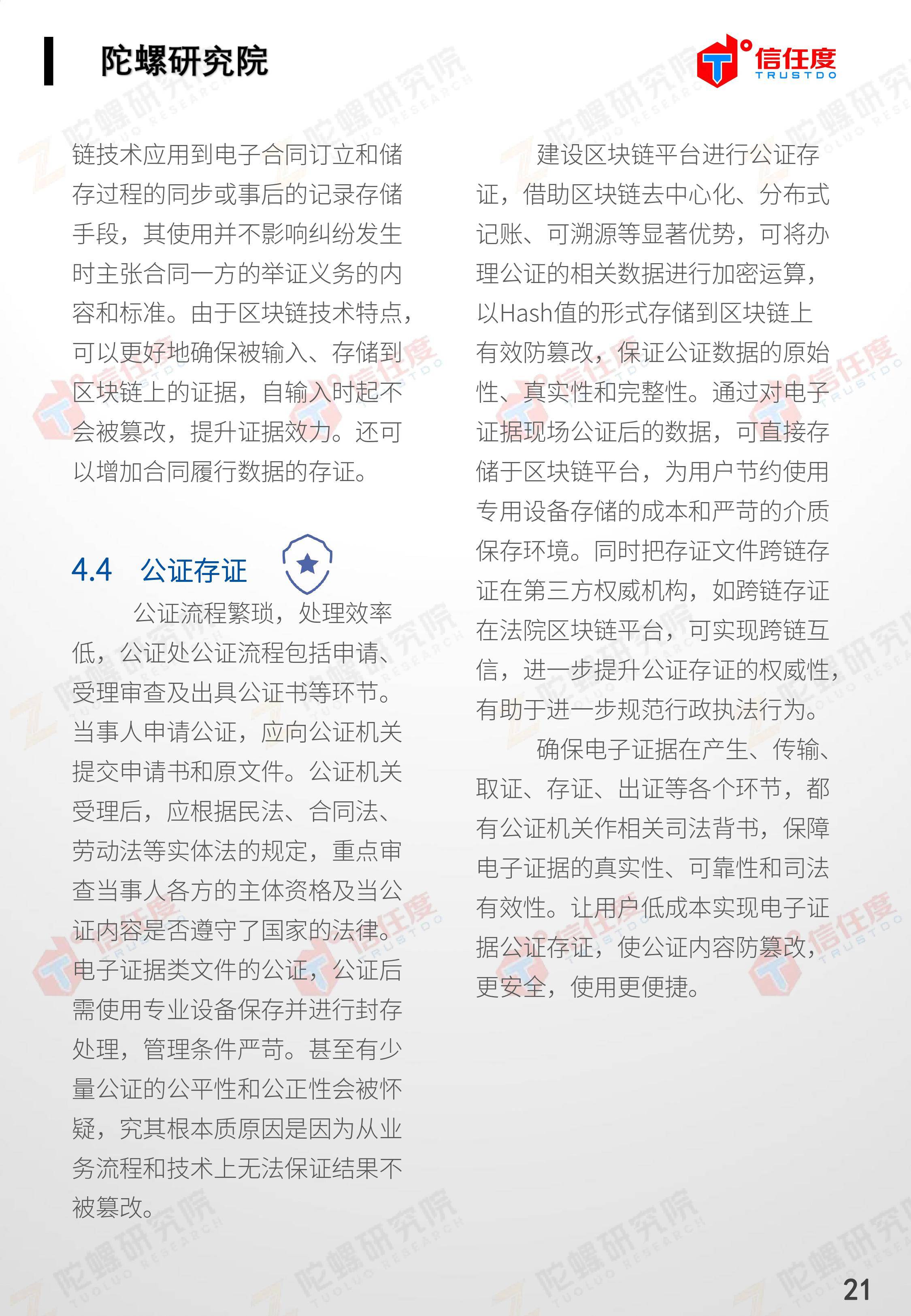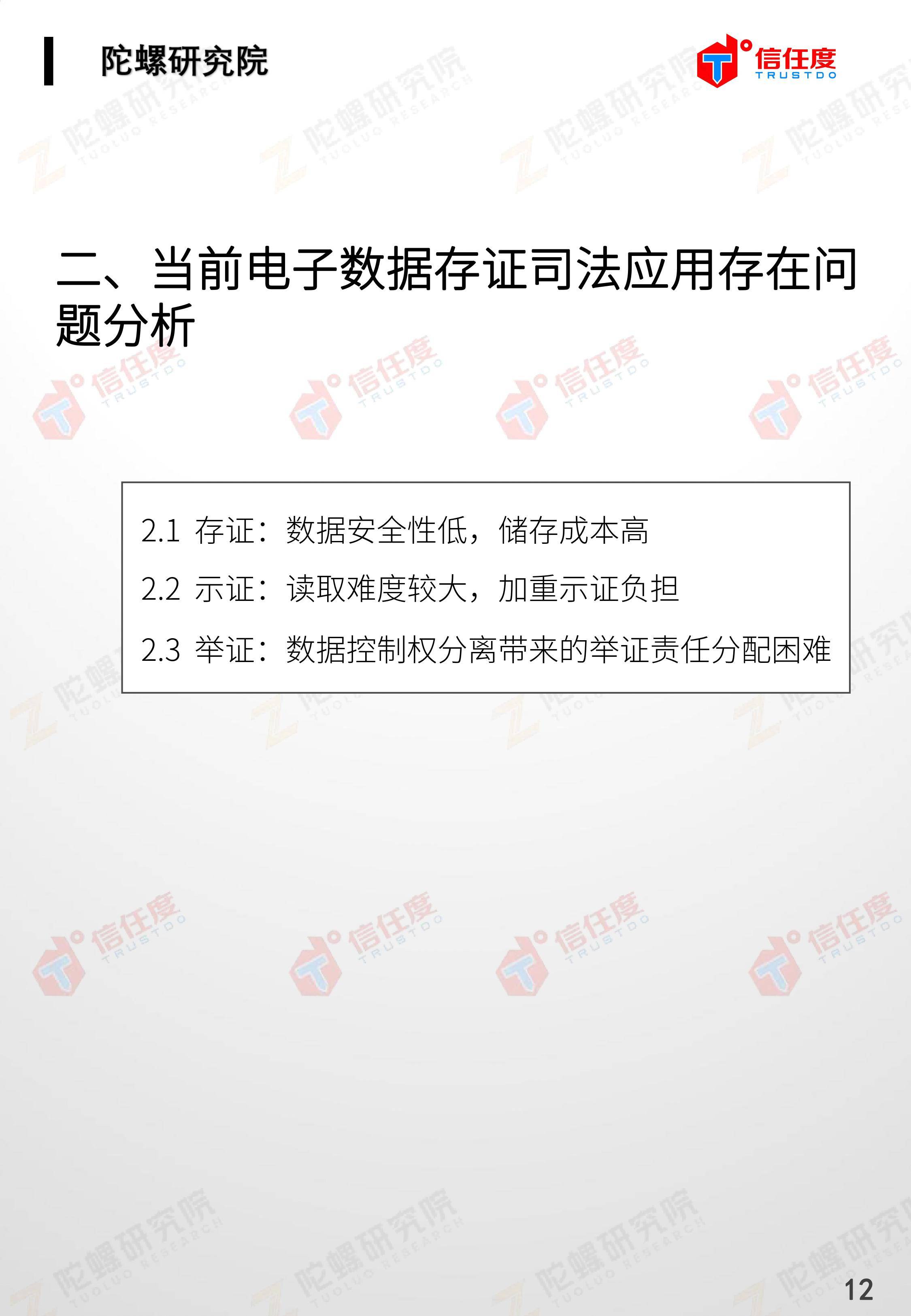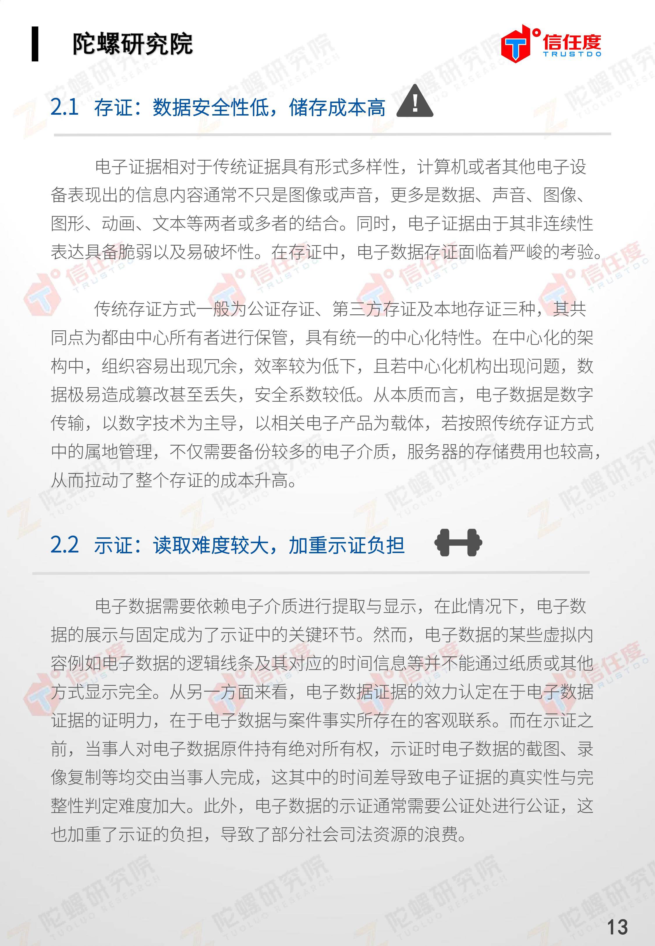 在此背景下,由陀螺研究院与北京信任度科技有限公司联合撰写,清华x-lab数权经济实验室、深圳市信息服务业区块链协会、碳链价值、网易区块链、商业科技观察、算力智库、数秦科技、火星财经、达瓴智库联合发布的《区块链司法存证应用报告》面市,本报告从电子数据存证背景入手,对当前电子数据存证司法应用存在问题进行了分析,介绍了区块链在电子数据存证中的应用价值,并针对区块链存证的应用场景与实际案例开展了深入研究,旨在加深社会大众对于区块链司法存证的理解,推动区块链在司法存证领域迸发出更大的价值。