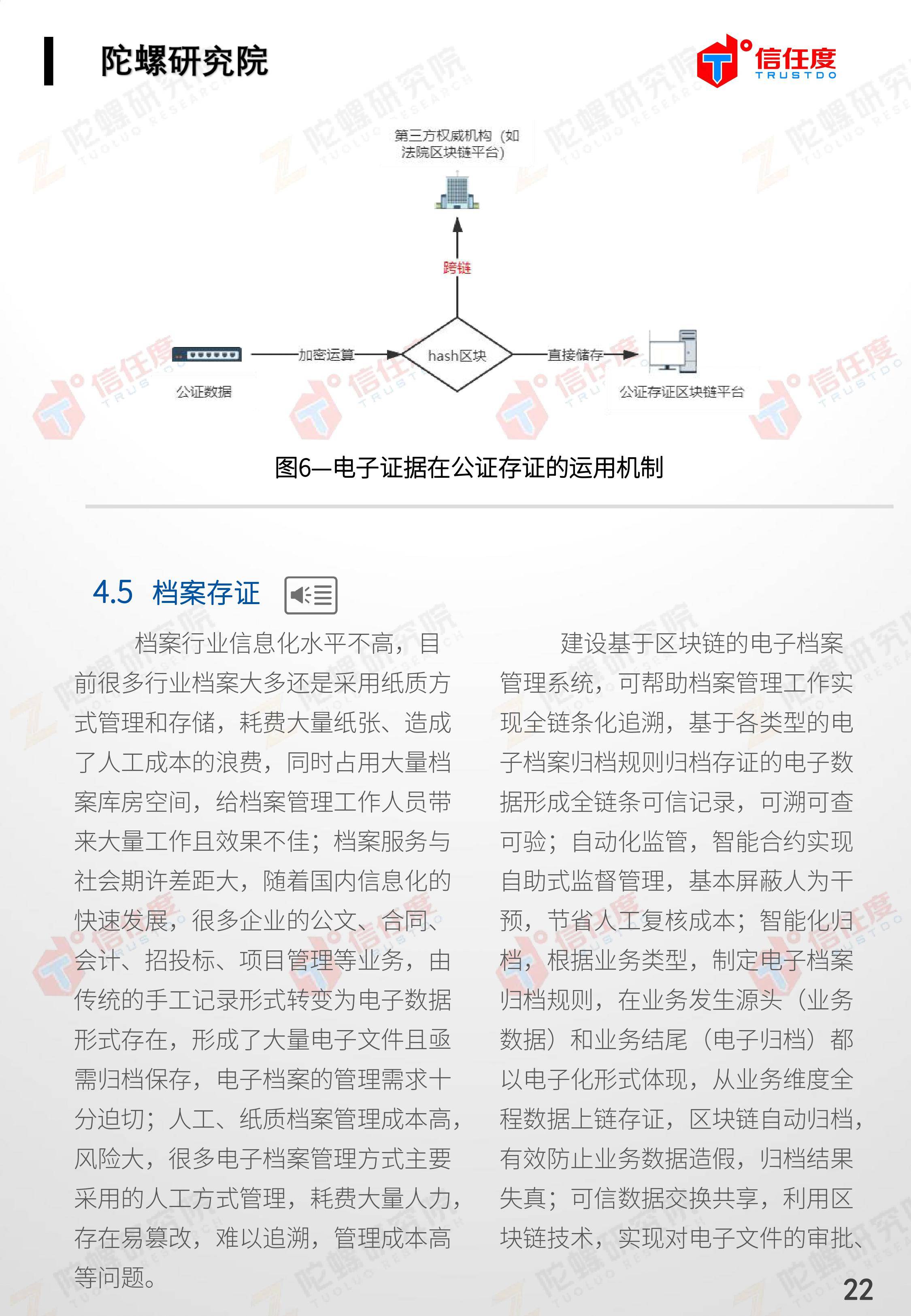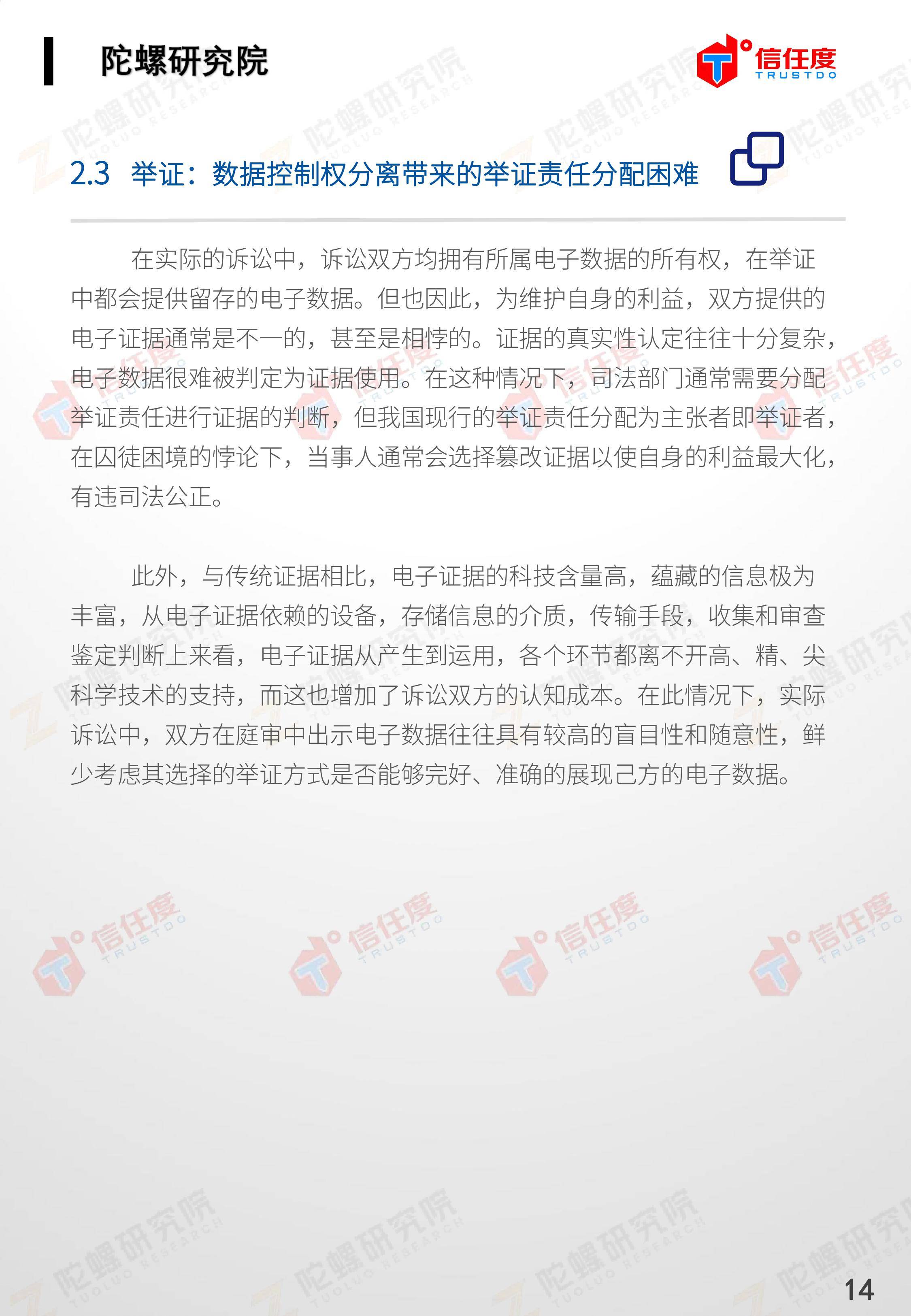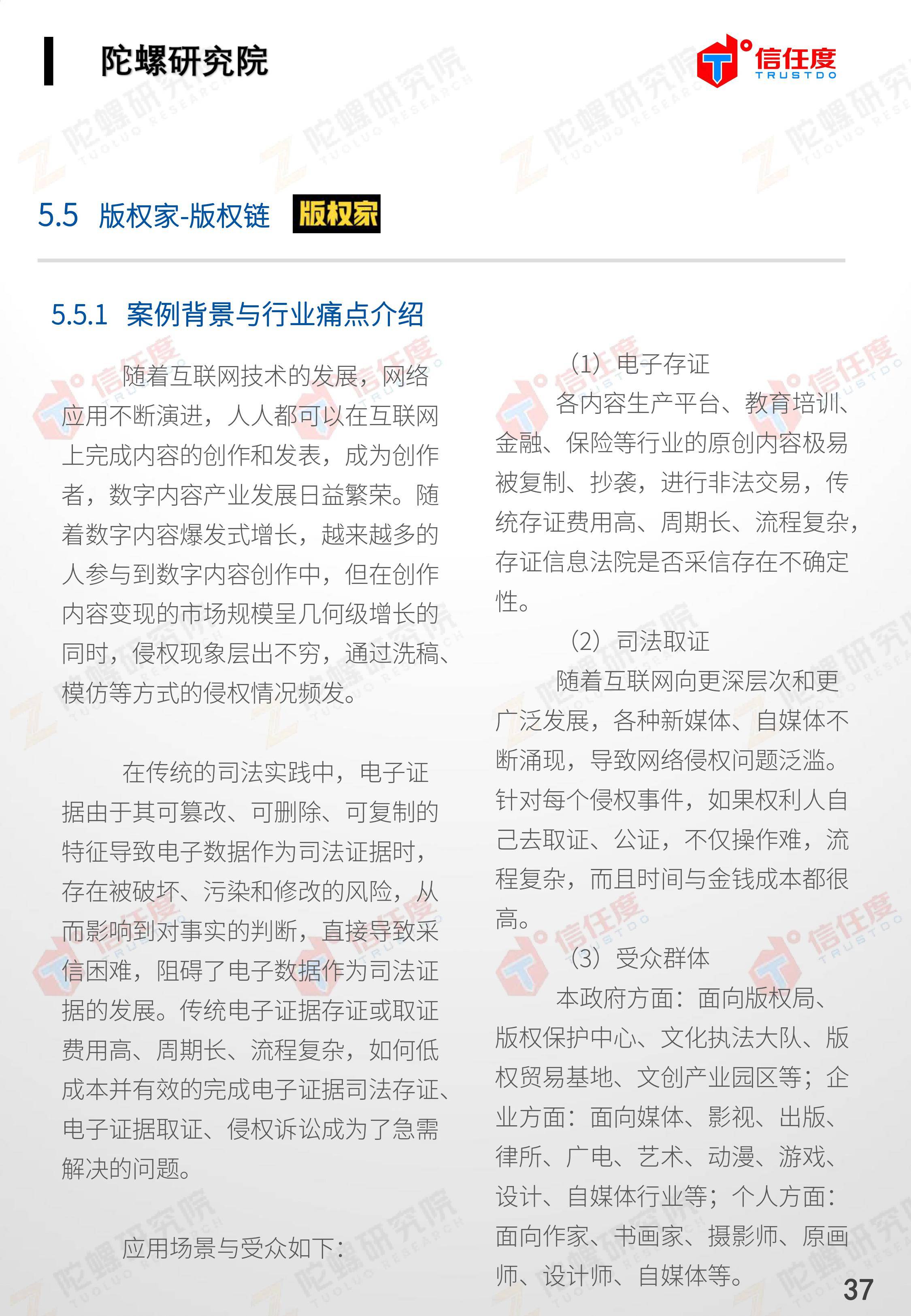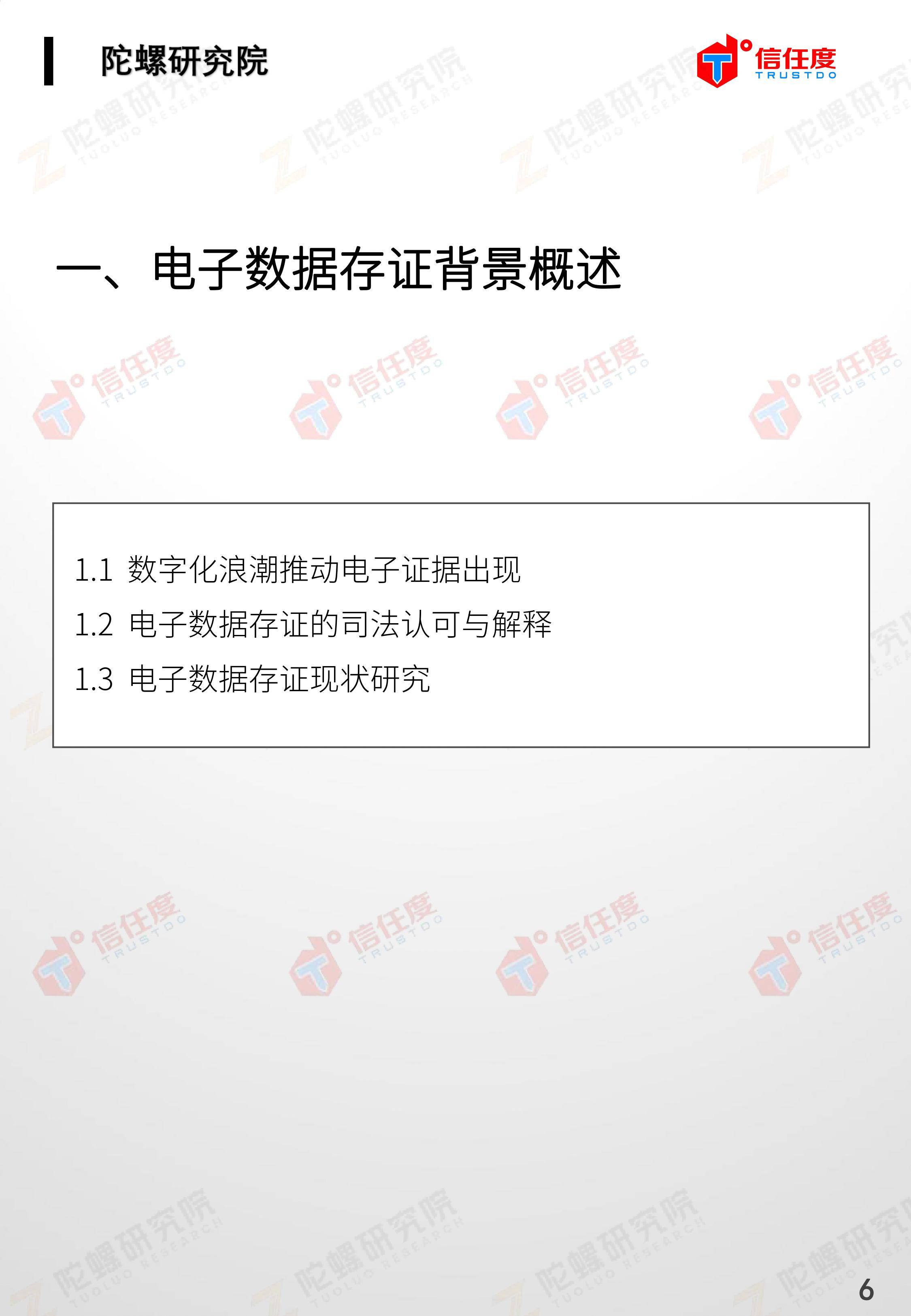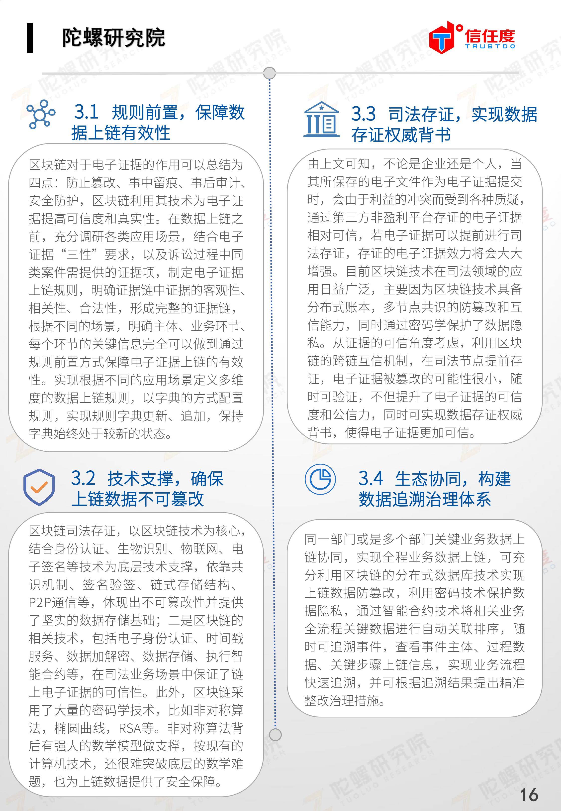 在此背景下,由陀螺研究院与北京信任度科技有限公司联合撰写,清华x-lab数权经济实验室、深圳市信息服务业区块链协会、碳链价值、网易区块链、商业科技观察、算力智库、数秦科技、火星财经、达瓴智库联合发布的《区块链司法存证应用报告》面市,本报告从电子数据存证背景入手,对当前电子数据存证司法应用存在问题进行了分析,介绍了区块链在电子数据存证中的应用价值,并针对区块链存证的应用场景与实际案例开展了深入研究,旨在加深社会大众对于区块链司法存证的理解,推动区块链在司法存证领域迸发出更大的价值。