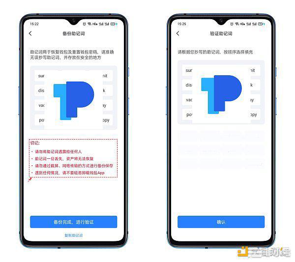 3、【备份助记词】界面需要我们根据提供的助记词单词和顺序正确记录,确认记录好以后点击【备份完成 进行验证】按照正确顺序完成助记词验证。完成助记词验证后即可注册成功。